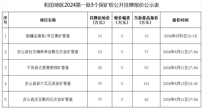【已成交】和田地區(qū)2024第一批5個(gè)探礦權(quán)公開(kāi)掛牌報(bào)價(jià)公示