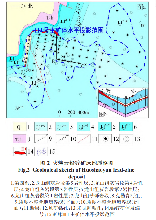(1)火燒云鉛鋅礦產(chǎn)于喀喇昆侖中生代陸緣沉積盆地中,含礦地層為中侏羅統(tǒng)龍山組,礦體產(chǎn)狀與地層產(chǎn)狀一致,呈近水平、略有舒緩波狀起伏的層狀產(chǎn)出。