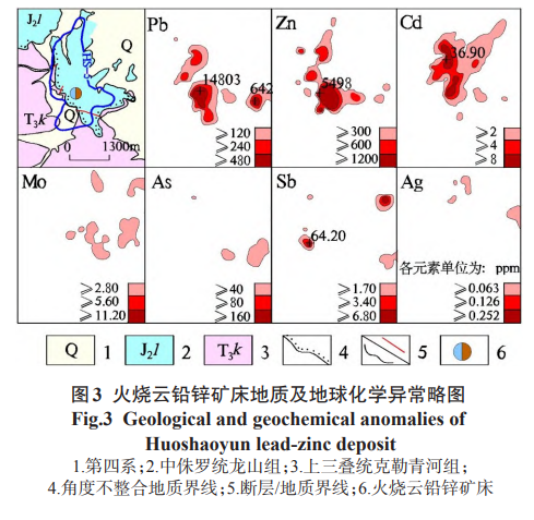 2011年,新疆地礦局第八地質(zhì)大隊在喀喇昆侖山腹地對 1∶50 萬區(qū)域化探 Hs58-乙 2異常開展檢查發(fā)現(xiàn)了火燒云鉛鋅礦,經(jīng)評價成為我國最大、亞洲第二大鉛鋅礦床。礦床產(chǎn)于喀拉昆侖-三江成礦省之林濟塘Pb,Zn,Cu,Au,Mo、石膏礦帶(Ⅳ級)中,賦礦地層為中侏羅統(tǒng)龍山組。