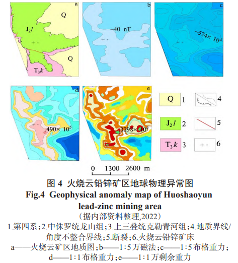 表明礦區(qū)一帶巖漿熱液活動微弱,鐵磁類物質(zhì)匱乏。1∶5萬布格重力在礦區(qū)一帶總體處于重力低(極值-574×10-5m/s2)場區(qū),在大面積重力低背景場中出現(xiàn)局部相對重力高?;馃沏U鋅礦與局部相對重力高(極值-573×10-5 m/s2)對應(yīng)。