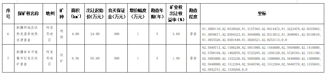 出讓探礦權名稱、面積、拐點坐標、掛牌起始價、增價幅度等基本情況(見附件1)。