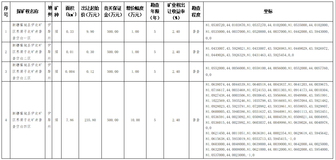 為促進(jìn)礦產(chǎn)資源勘查開采,按照相關(guān)法律法規(guī)的規(guī)定,經(jīng)自治區(qū)人民政府批準(zhǔn),受自治區(qū)自然資源廳委托,新疆維吾爾自治區(qū)政務(wù)服務(wù)和公共資源交易中心(以下簡稱交易中心)以掛牌方式出讓新疆霍城縣伊北礦區(qū)界梁子北礦井普查空白一區(qū)等4個(gè)探礦權(quán)。現(xiàn)將有關(guān)事項(xiàng)公告如下: