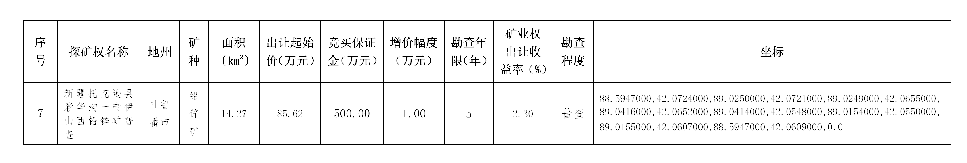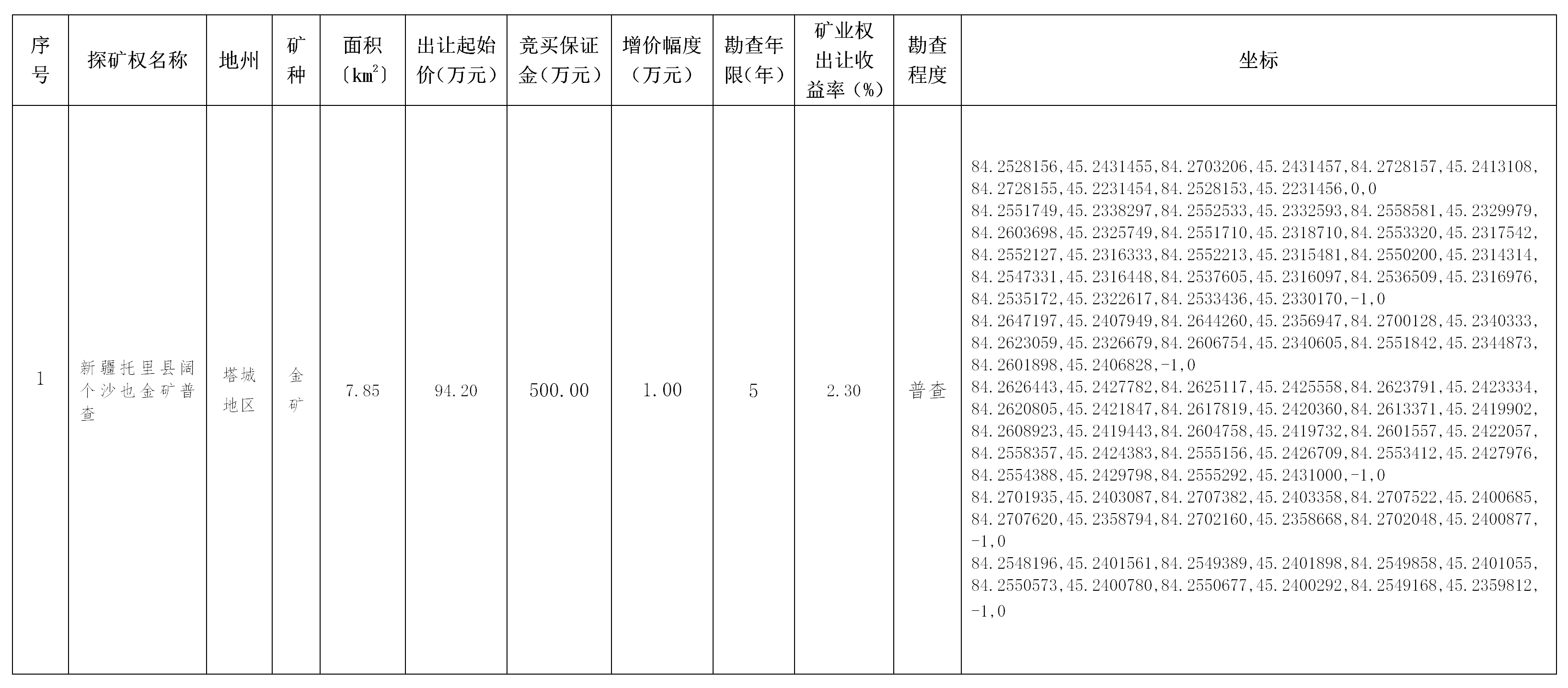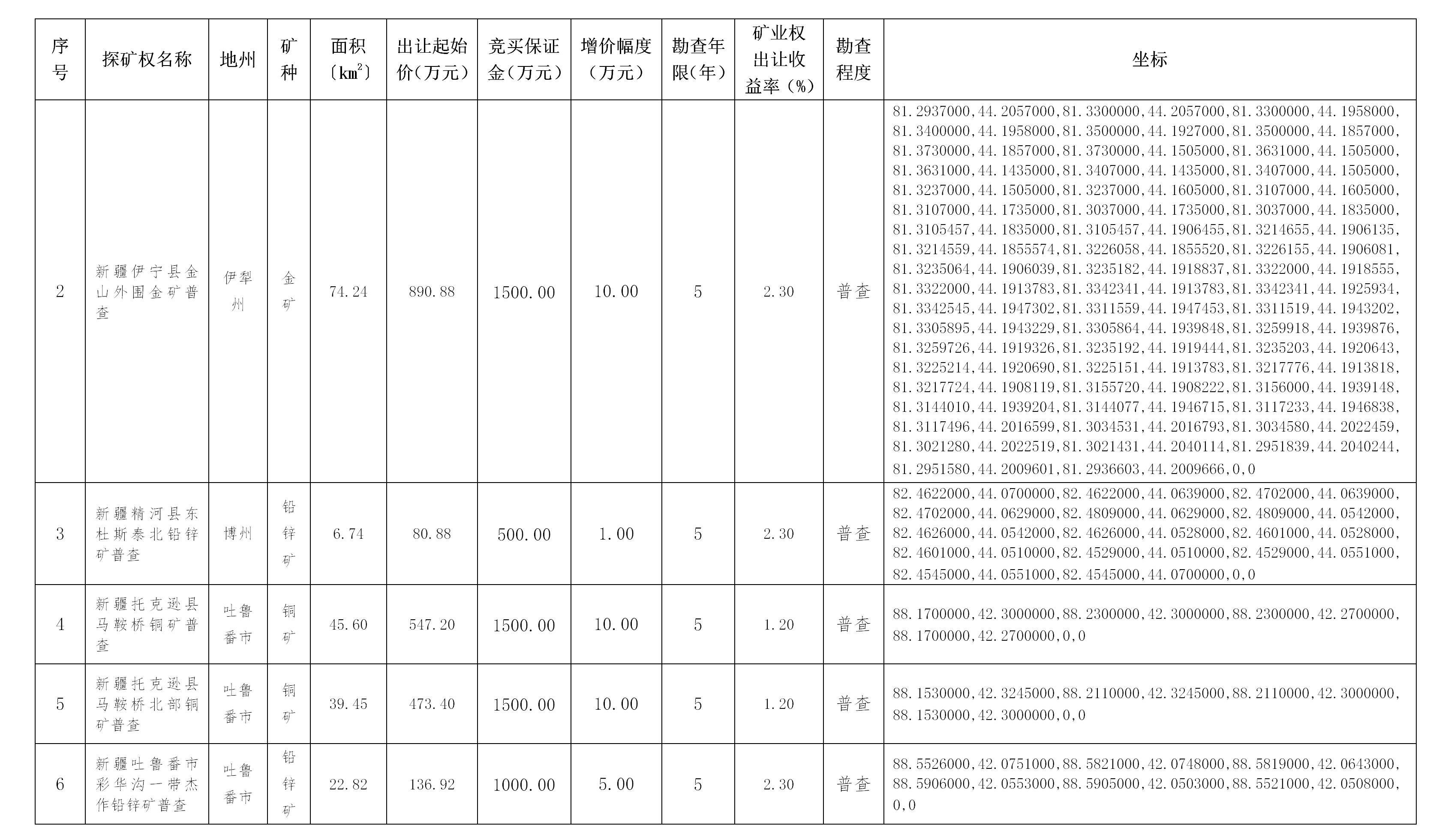 出讓探礦權(quán)名稱、面積、拐點(diǎn)坐標(biāo)、掛牌起始價(jià)、增價(jià)幅度等基本情況(見附件1)。