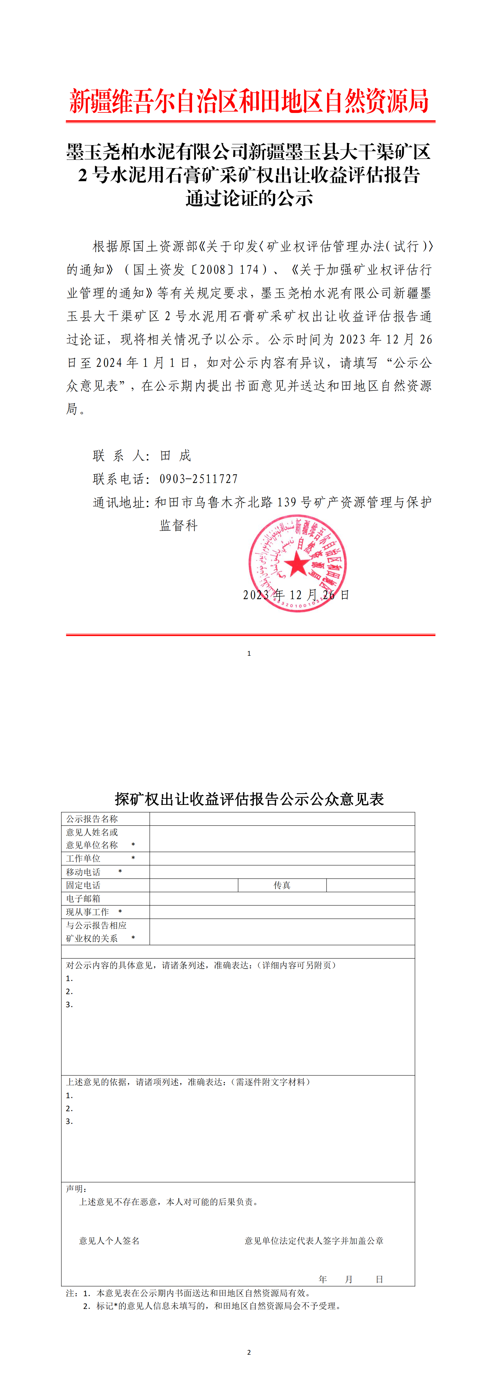 墨玉堯柏水泥有限公司新疆墨玉縣大干渠礦區(qū)2 號(hào)水泥用石膏礦采礦權(quán)出讓收益評(píng)估報(bào)告通過(guò)論證的公示