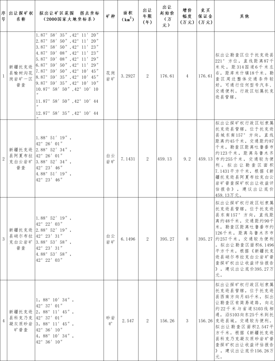 為深化礦產資源有償使用制度,培育和建立規(guī)范、開放、競爭、有序的礦業(yè)權市場,促進礦產資源有序開發(fā),根據《中華人民共和國礦產資源法》、《礦業(yè)權出讓交易規(guī)則》(自然資規(guī)〔2023〕1號)、《關于印發(fā)〈新疆維吾爾自治區(qū)礦產資源管理若干事項暫行辦法〉的通知》(新自然資規(guī)〔2021〕1號),經吐魯番市人民政府批準,吐魯番市自然資源局委托吐魯番市建正建設工程交易有限公司(以下簡稱“建正公司”)以掛牌方式出讓新疆托克遜縣科克乃克凝灰質砂巖礦普查等4個探礦權。現將有關事項公告如下: