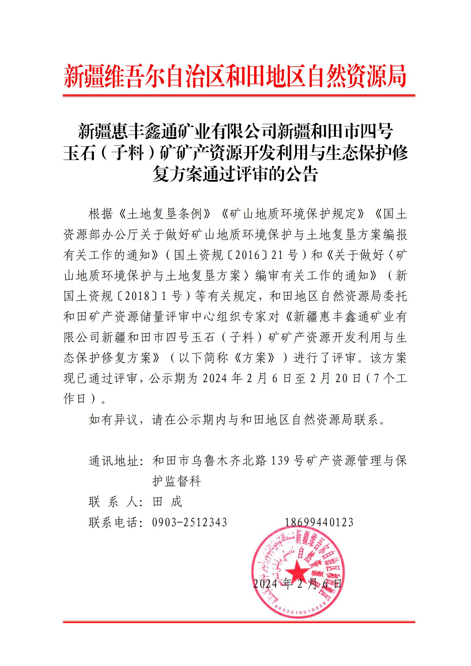 新疆惠豐鑫通礦業(yè)有限公司新疆和田市四號 玉石(子料)礦礦產(chǎn)資源開發(fā)利用與生態(tài)保護修復(fù)方案通過評審的公告