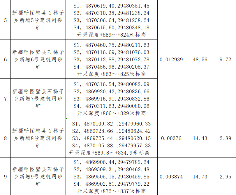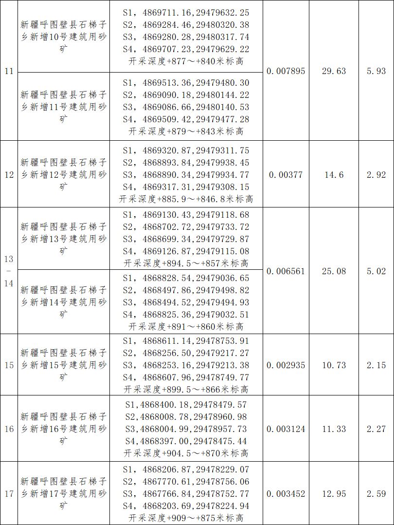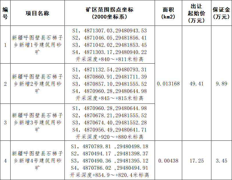 呼圖壁縣石梯子鄉(xiāng)新增1-17號建筑用砂礦空白區(qū)采礦權出讓評估報告已通過專家評審,采礦權評估值134.68萬元(按資源儲量合1.35元/立方米)。根據(jù)《關于石梯子鄉(xiāng)新增1-17號建筑用砂礦空白區(qū)采礦權公開掛牌出讓方案的批復》 呼縣政函【2024】7號會議決定,確定資源儲量掛牌出讓起始單價為2.5元/立方米,具體礦區(qū)出讓起始價見下表。