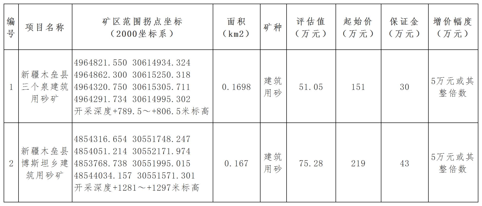 新疆木壘縣三個泉等2家建筑用砂礦采礦權(quán)出讓收益報告已通過專家評審,各礦山掛牌起始價及保證金確定如下: