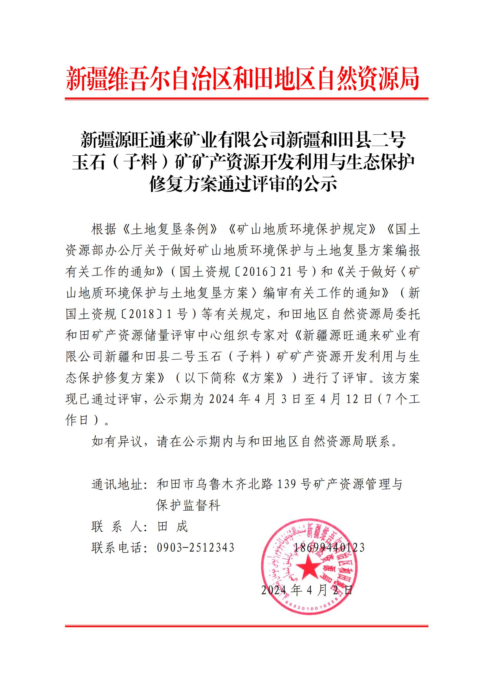 新疆源旺通來(lái)礦業(yè)有限公司新疆和田縣一號(hào)玉石(子料)礦礦產(chǎn)資源開發(fā)利用與生態(tài)保護(hù)修復(fù)方案通過(guò)評(píng)審的公示
