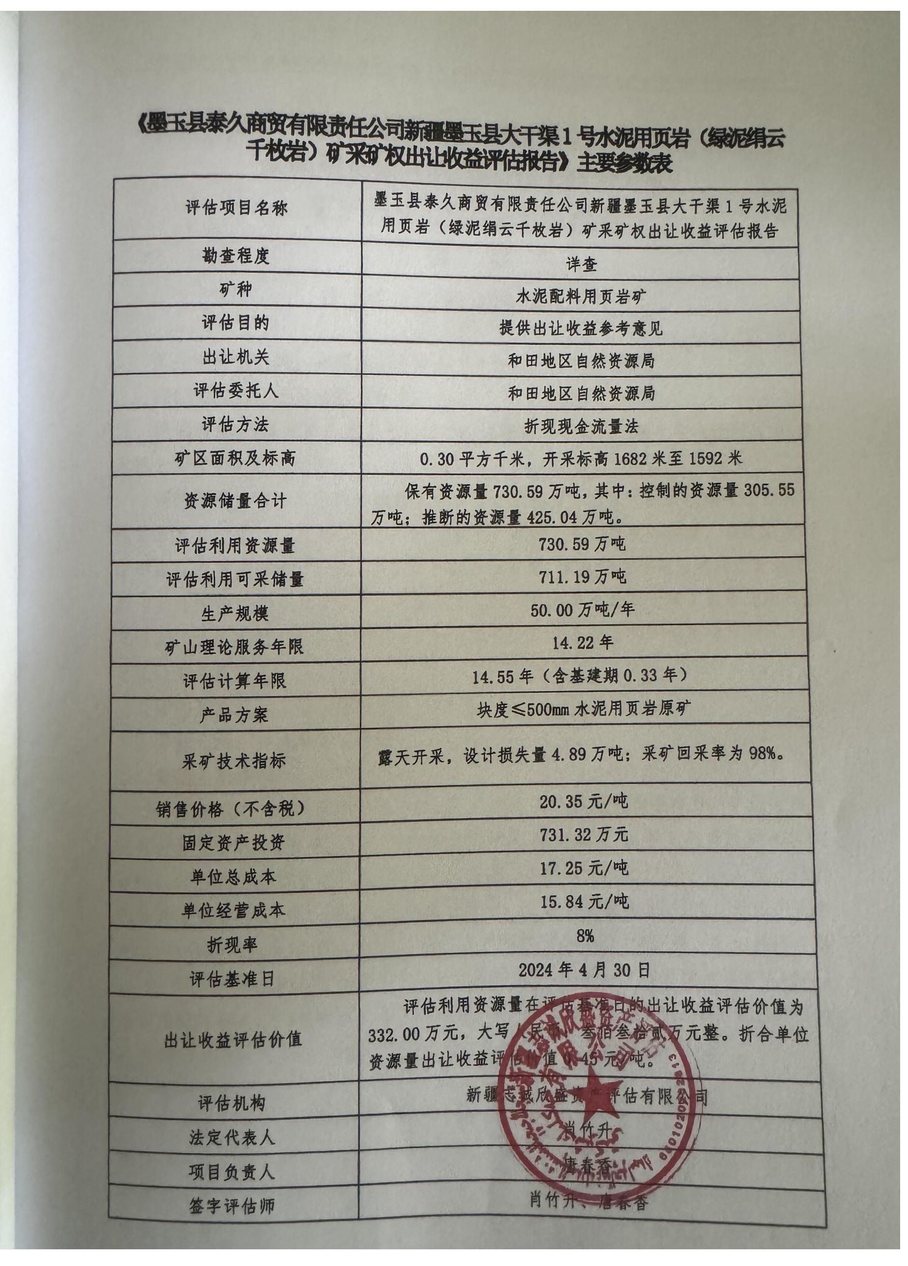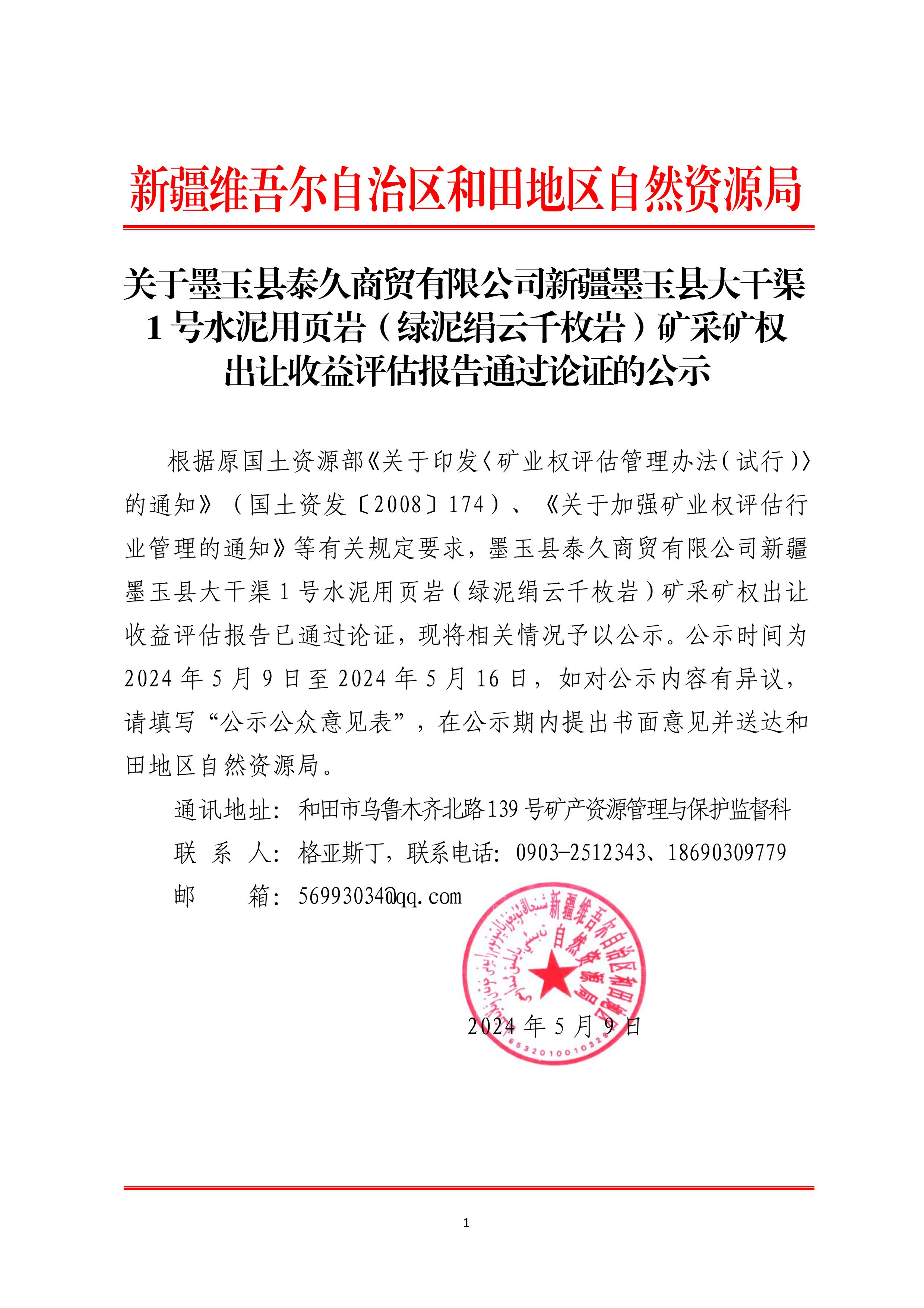 關(guān)于墨玉縣泰久商貿(mào)有限公司新疆墨玉縣大干渠1號(hào)水泥用頁(yè)巖(綠泥絹云千枚巖)礦采礦權(quán)出讓收益評(píng)估報(bào)告 通過(guò)論證的公示