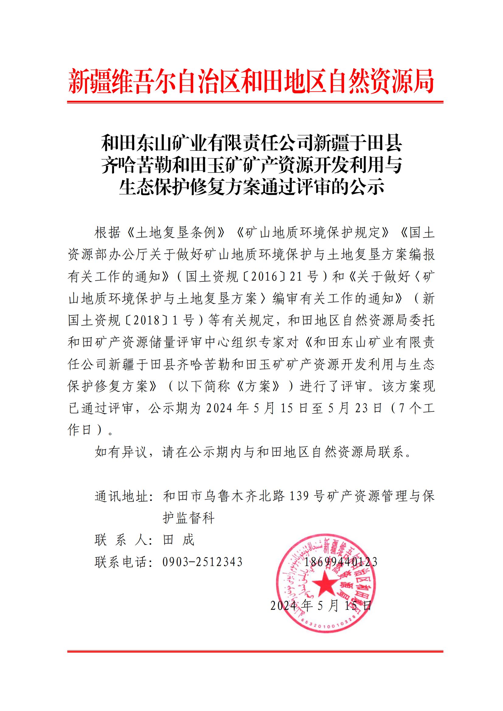 和田東山礦業(yè)有限責(zé)任公司新疆于田縣齊哈苦勒和田玉礦礦產(chǎn)資源開發(fā)利用與生態(tài)保護(hù)修復(fù)方案通過(guò)評(píng)審的公示