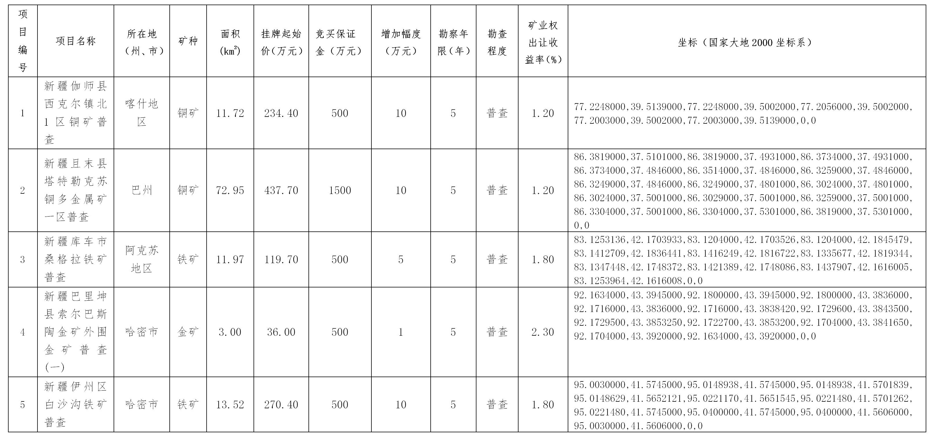 為促進礦產(chǎn)資源勘查開采,按照相關法律法規(guī)的規(guī)定,經(jīng)自治區(qū)人民政府批準,受自治區(qū)自然資源廳委托,新疆維吾爾自治區(qū)政務服務和公共資源交易中心(以下簡稱交易中心)以掛牌方式出讓新疆伽師縣西克爾鎮(zhèn)北1區(qū)銅礦普查等10個探礦權(quán)。現(xiàn)將有關事項公告如下: