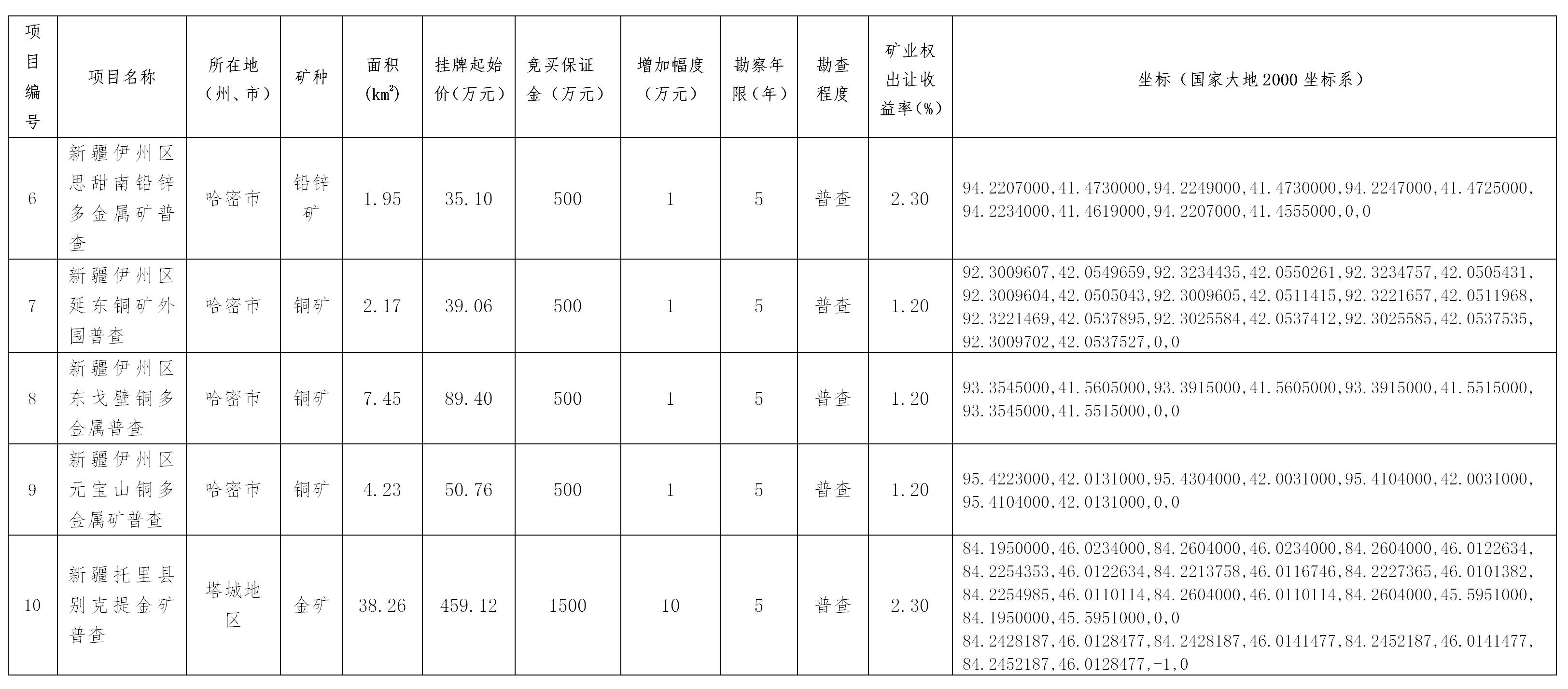 出讓探礦權(quán)名稱、面積、拐點坐標、掛牌起始價、礦業(yè)權(quán)出讓收益率、增價幅度等基本情況(見附件1)。