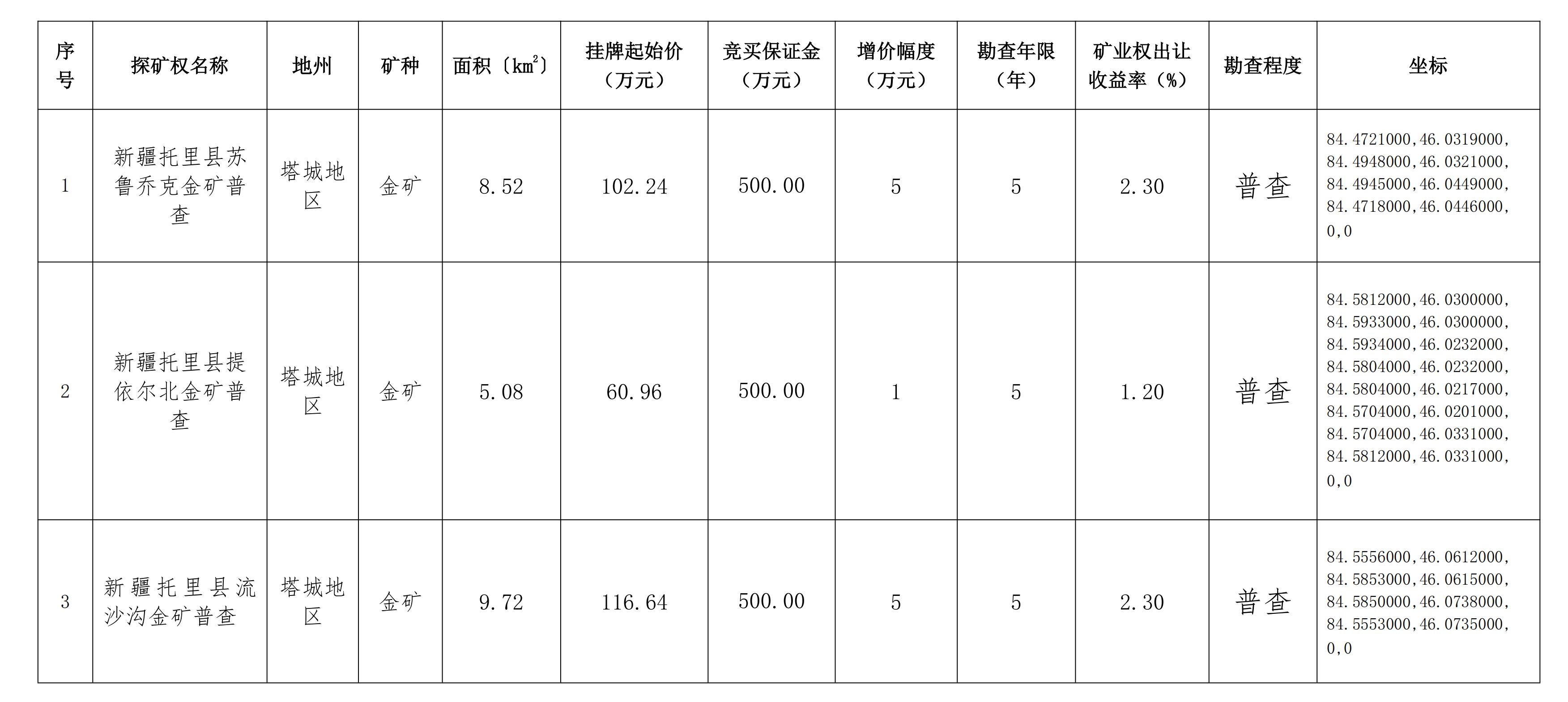 為促進(jìn)礦產(chǎn)資源勘查開采,按照相關(guān)法律法規(guī)的規(guī)定,經(jīng)自治區(qū)人民政府批準(zhǔn),受自治區(qū)自然資源廳委托,新疆維吾爾自治區(qū)政務(wù)服務(wù)和公共資源交易中心(以下簡稱交易中心)以掛牌方式出讓新疆托里縣蘇魯喬克金礦普查等5個(gè)探礦權(quán)?,F(xiàn)將有關(guān)事項(xiàng)公告如下: