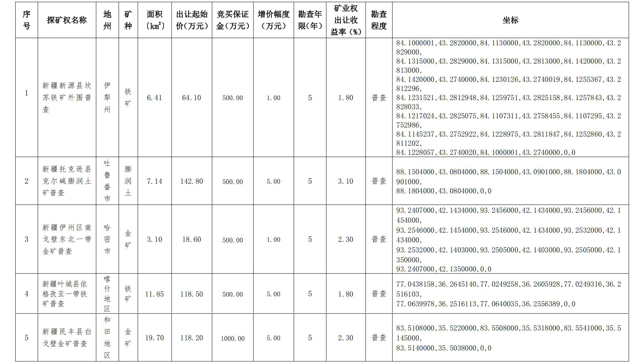 出讓探礦權(quán)名稱(chēng)、面積、拐點(diǎn)坐標(biāo)、掛牌起始價(jià)、增價(jià)幅度等基本情況(見(jiàn)附件1)。