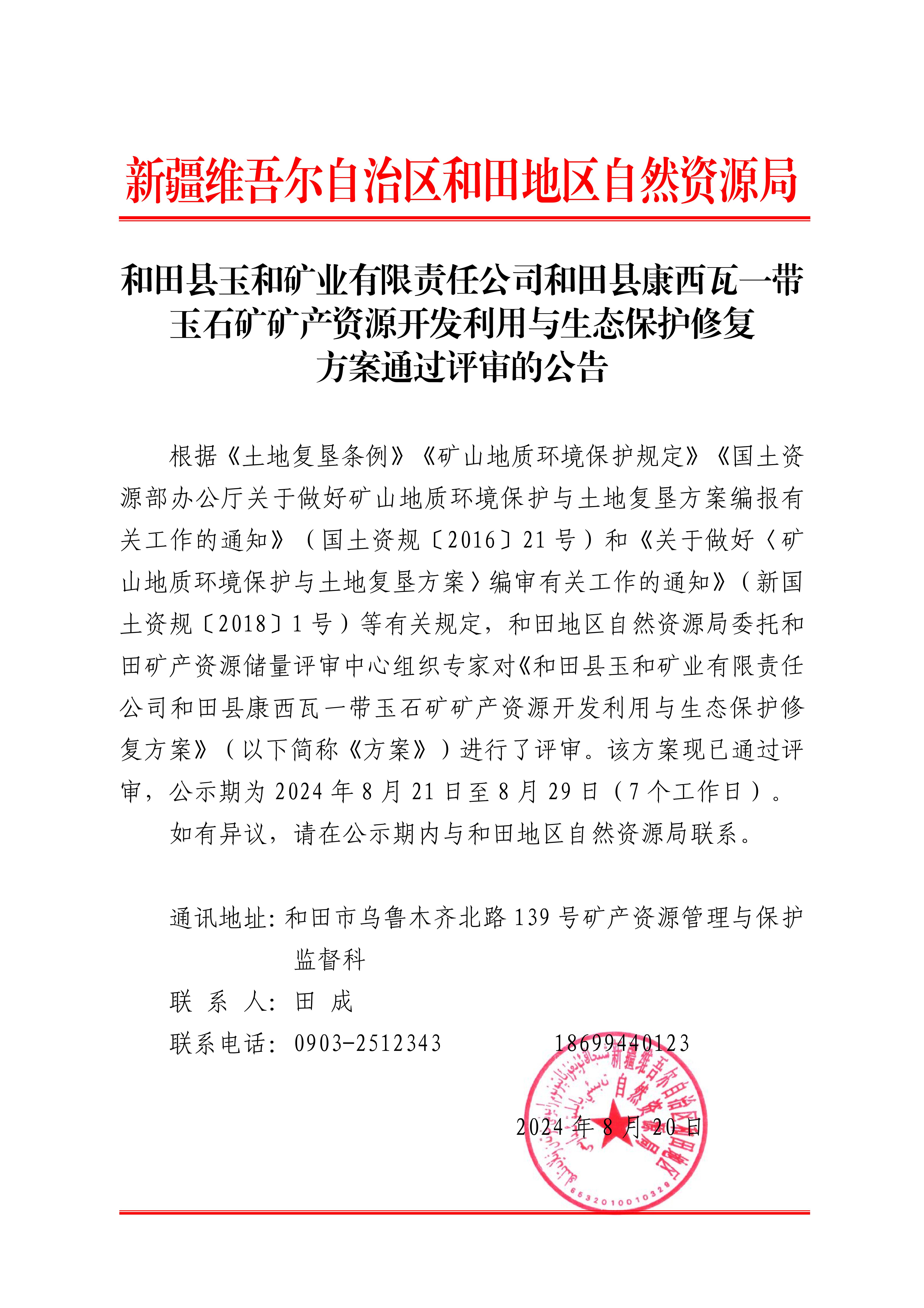 和田縣玉和礦業(yè)有限責(zé)任公司和田縣康西瓦一帶玉石礦礦產(chǎn)資源開發(fā)利用與生態(tài)保護(hù)修復(fù)方案通過評審的公告