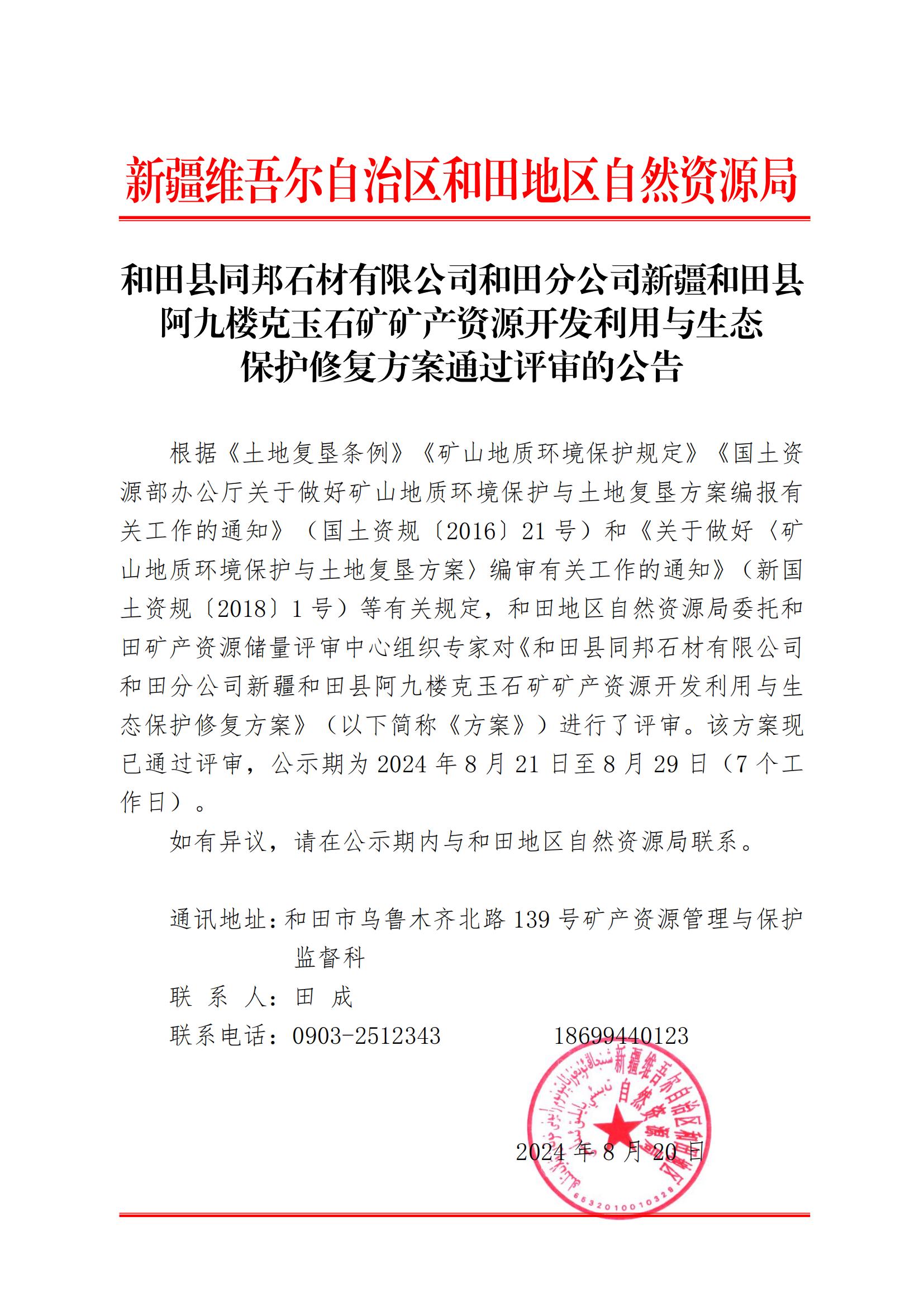 和田縣同邦石材有限公司和田分公司新疆和田縣阿九樓克玉石礦礦產(chǎn)資源開發(fā)利用與生態(tài)保護修復方案通過評審的公告