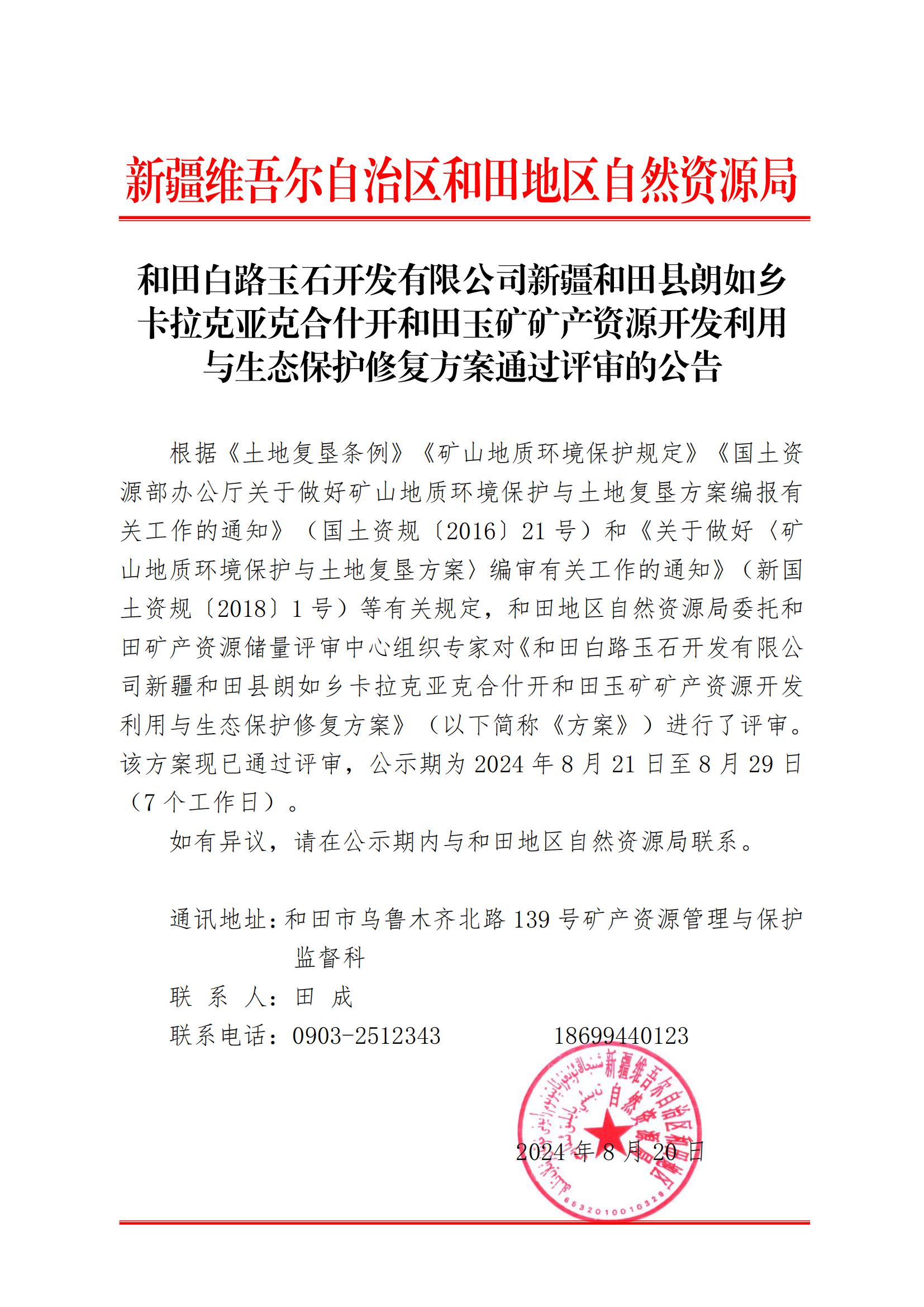 和田白路玉石開發(fā)有限公司新疆和田縣朗如鄉(xiāng)卡拉克亞克合什開和田玉礦礦產(chǎn)資源開發(fā)利用與生態(tài)保護(hù)修復(fù)方案通過評審的公告