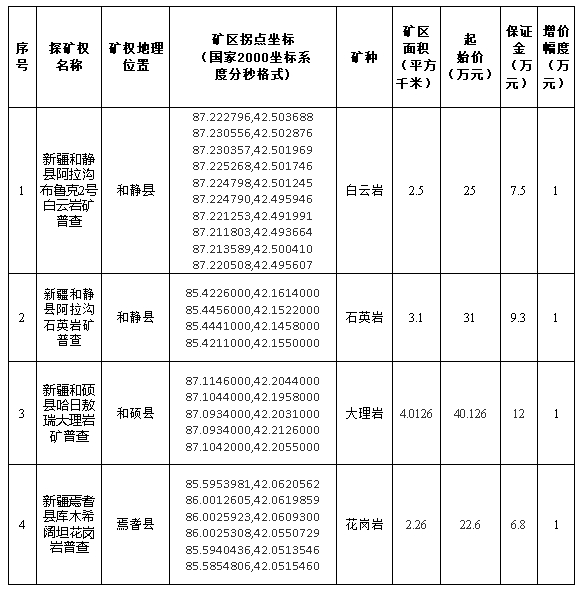 根據(jù)《中華人民共和國礦產(chǎn)資源法》、《礦產(chǎn)資源勘查區(qū)塊登記管理辦法》、《自然資源部關(guān)于印發(fā)礦業(yè)權(quán)出讓交易規(guī)則的通知》(自然資規(guī)〔2023〕1號)等相關(guān)法律法規(guī)規(guī)定,巴州政務(wù)服務(wù)和公共資源交易中心受巴州自然資源局委托,對新疆新疆和靜縣阿拉溝布魯克2號白云巖礦普查等4個探礦權(quán)以掛牌方式公開出讓,現(xiàn)將有關(guān)事項公告如下:
