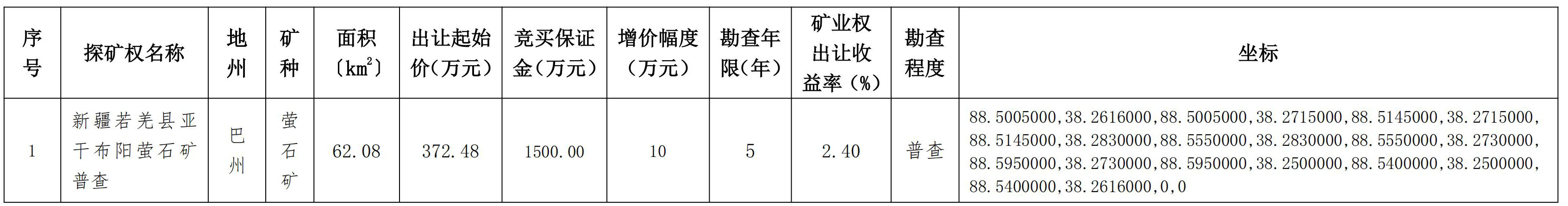 出讓探礦權(quán)名稱(chēng)、面積、拐點(diǎn)坐標(biāo)、掛牌起始價(jià)、礦業(yè)權(quán)出讓收益率、增價(jià)幅度等基本情況(見(jiàn)附件1)。