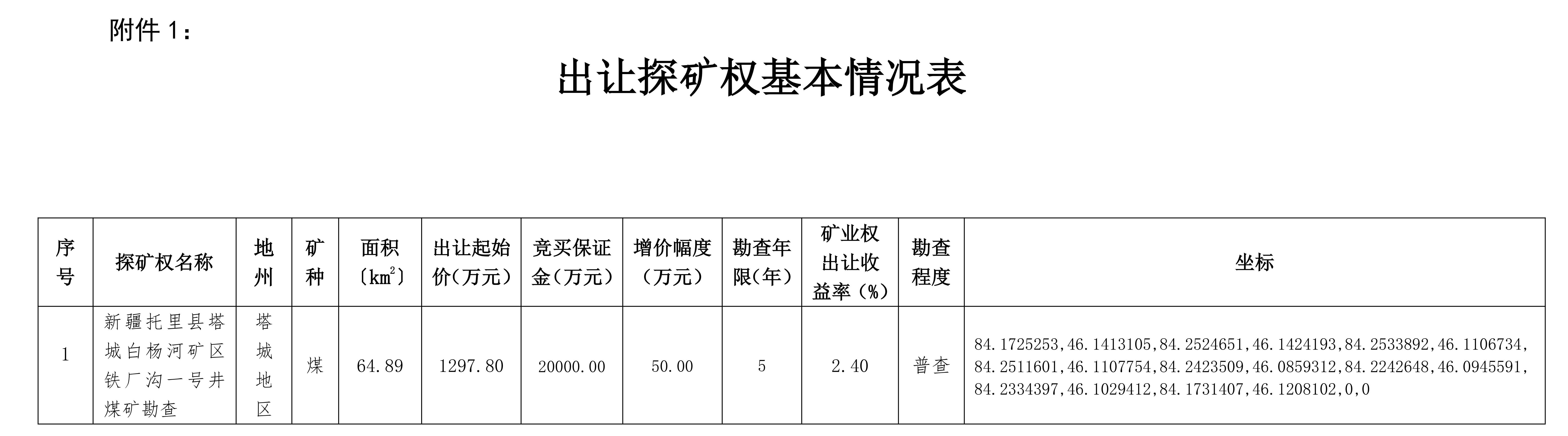 出讓探礦權名稱、面積、拐點坐標、掛牌起始價、增價幅度等基本情況(見附件1)。