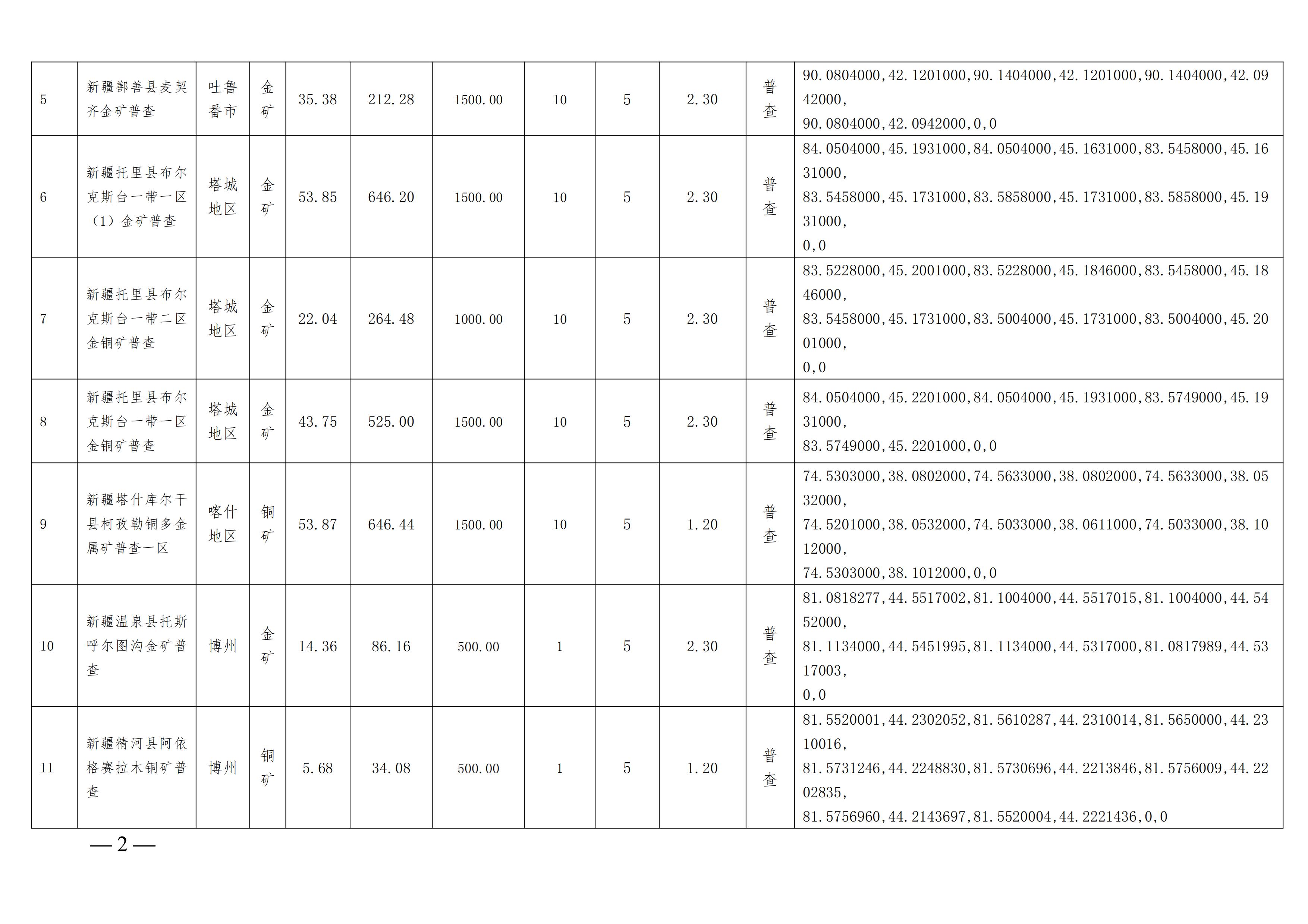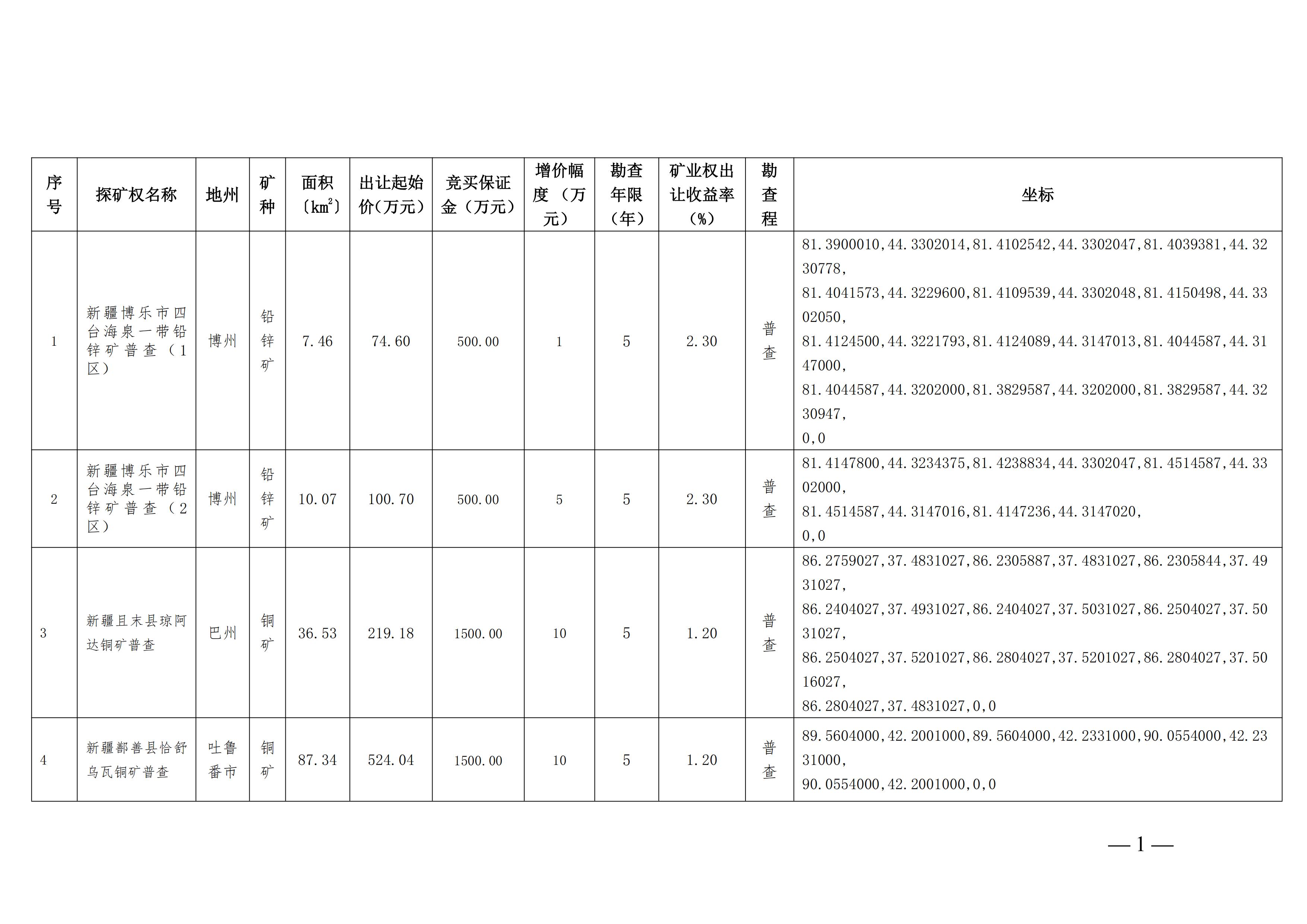 出讓探礦權(quán)名稱、面積、拐點(diǎn)坐標(biāo)、掛牌起始價(jià)、增價(jià)幅度等基本情況(見附件1)。