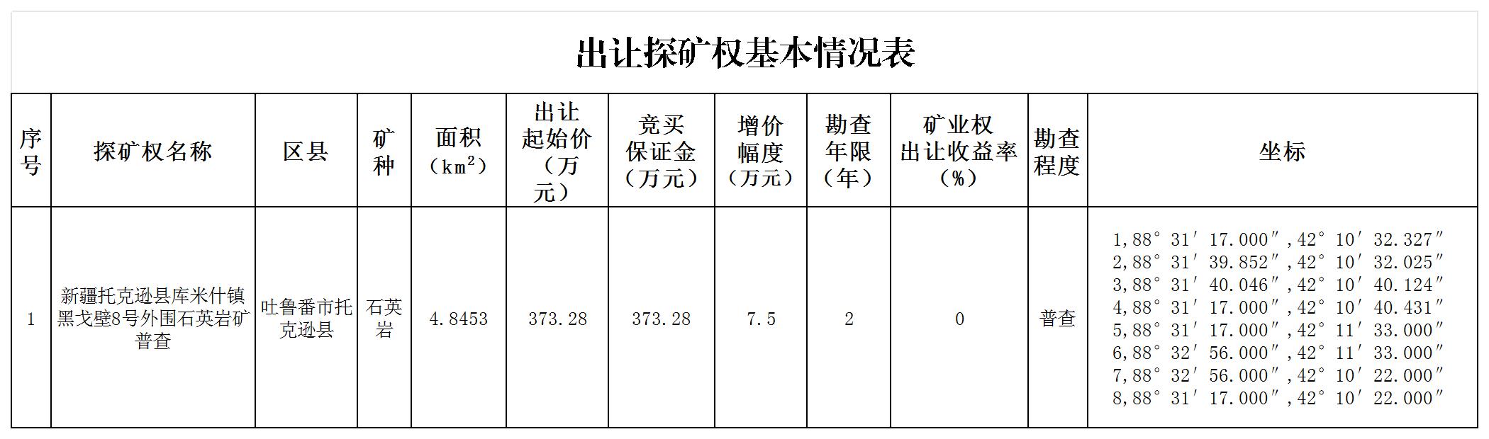 為深化礦產(chǎn)資源有償使用制度,培育和建立規(guī)范、開(kāi)放、競(jìng)爭(zhēng)、有序的礦業(yè)權(quán)市場(chǎng),促進(jìn)礦產(chǎn)資源有序開(kāi)發(fā),根據(jù)《中華人民共和國(guó)礦產(chǎn)資源法》、《礦業(yè)權(quán)出讓交易規(guī)則》(自然資規(guī)〔2023〕1號(hào))、《關(guān)于印發(fā)〈新疆維吾爾自治區(qū)礦產(chǎn)資源管理若干事項(xiàng)暫行辦法〉的通知》(新自然資規(guī)〔2021〕1號(hào)),經(jīng)吐魯番市人民政府批準(zhǔn),吐魯番市自然資源局委托吐魯番市公共資源交易有限公司(以下簡(jiǎn)稱“公共資源交易公司”)以掛牌方式出讓新疆托克遜縣庫(kù)米什鎮(zhèn)黑戈壁8號(hào)外圍石英巖礦普查探礦權(quán)?,F(xiàn)將有關(guān)事項(xiàng)公告如下:
