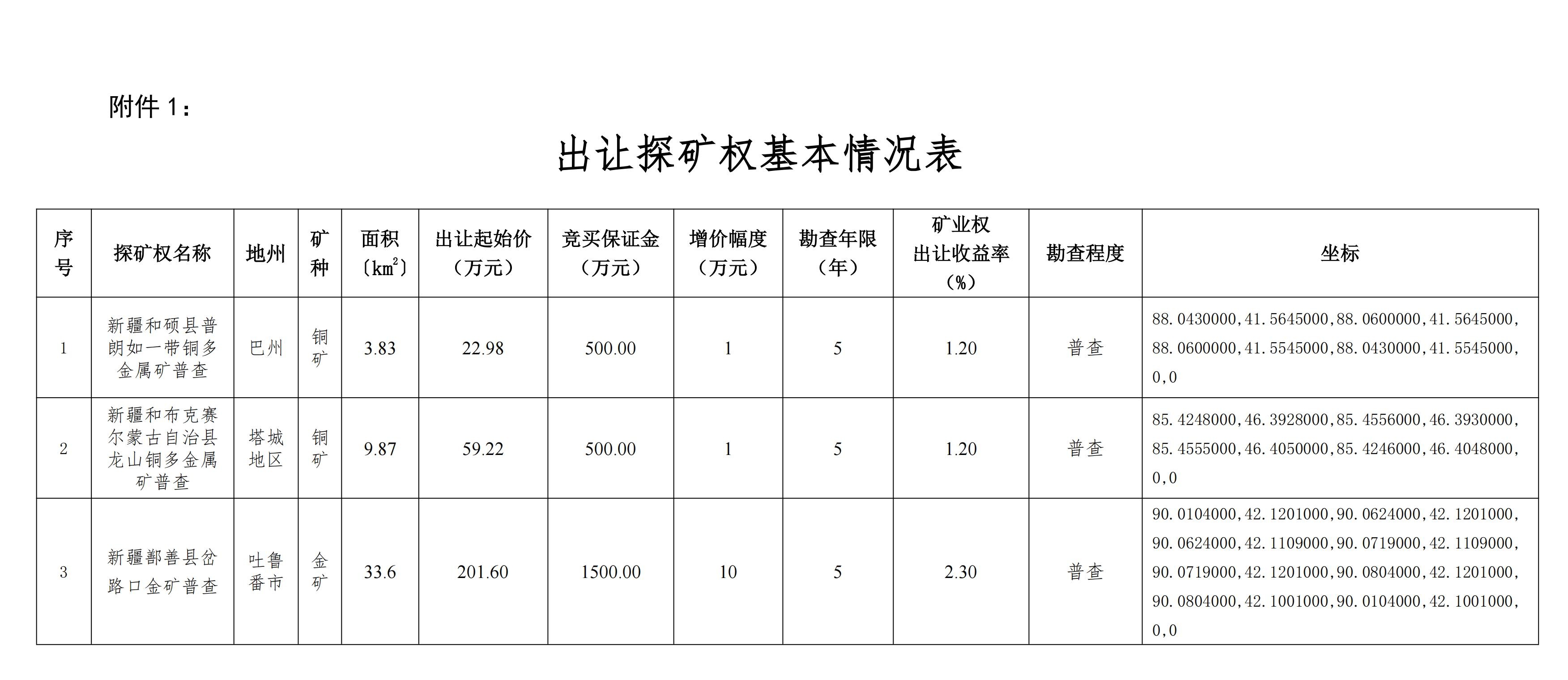 出讓探礦權(quán)名稱、面積、拐點坐標、掛牌起始價、增價幅度等基本情況(見附件1)。