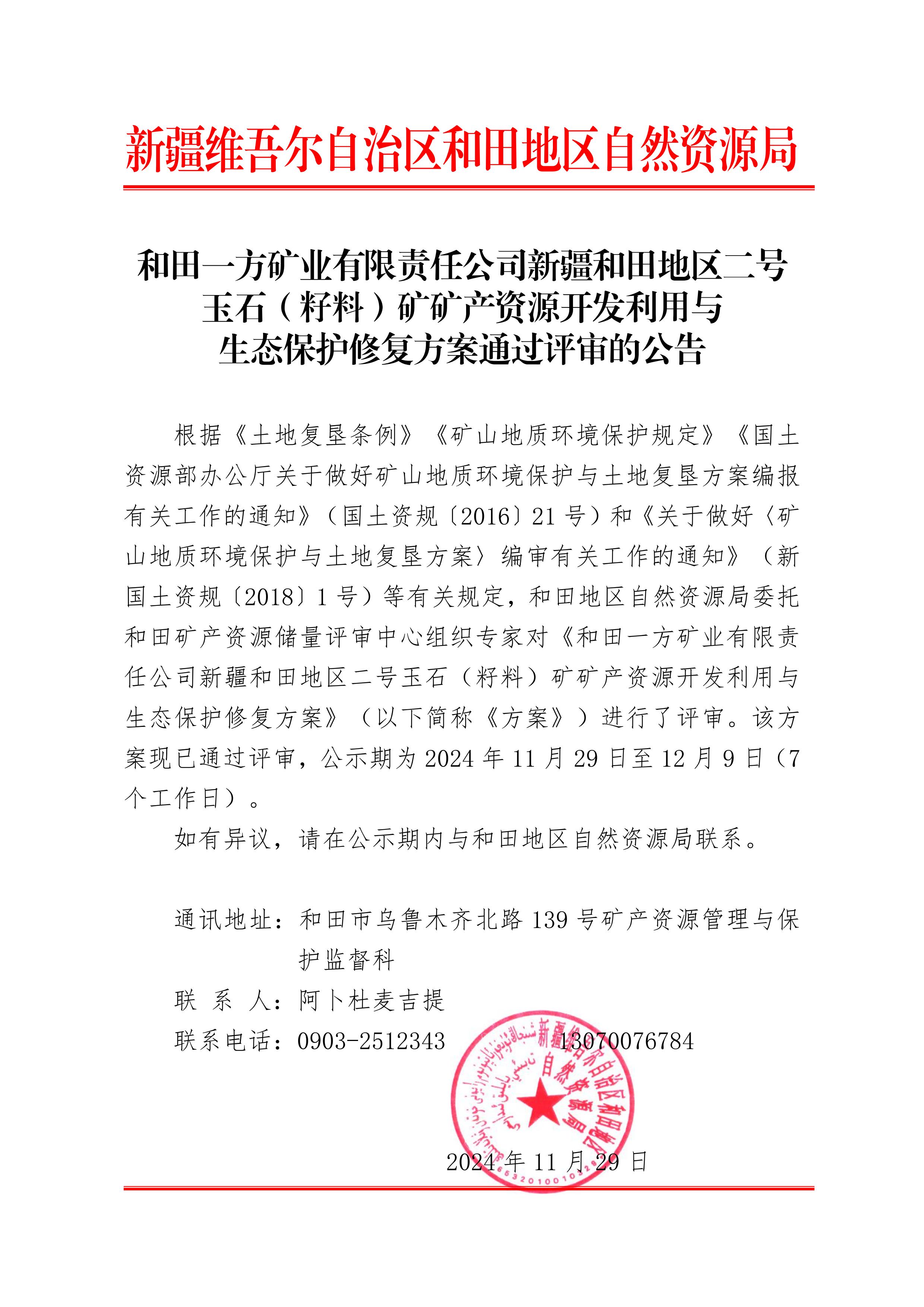 和田一方礦業(yè)有限責(zé)任公司新疆和田地區(qū)二號(hào)玉石(籽料)礦礦產(chǎn)資源開發(fā)利用與生態(tài)保護(hù)修復(fù)方案通過評(píng)審的公告