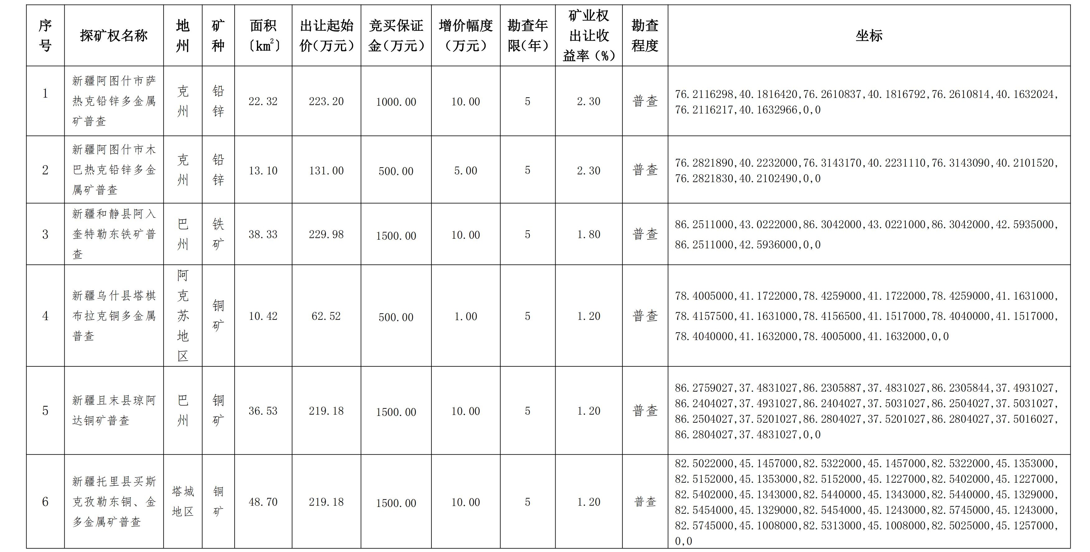 為促進(jìn)礦產(chǎn)資源勘查開采,按照相關(guān)法律法規(guī)的規(guī)定,經(jīng)自治區(qū)人民政府批準(zhǔn),受自治區(qū)自然資源廳委托,新疆維吾爾自治區(qū)政務(wù)服務(wù)和公共資源交易中心(以下簡(jiǎn)稱交易中心)以掛牌方式出讓新疆阿圖什市薩熱克鉛鋅多金屬礦普查等6個(gè)探礦權(quán)?,F(xiàn)將有關(guān)事項(xiàng)公告如下:
