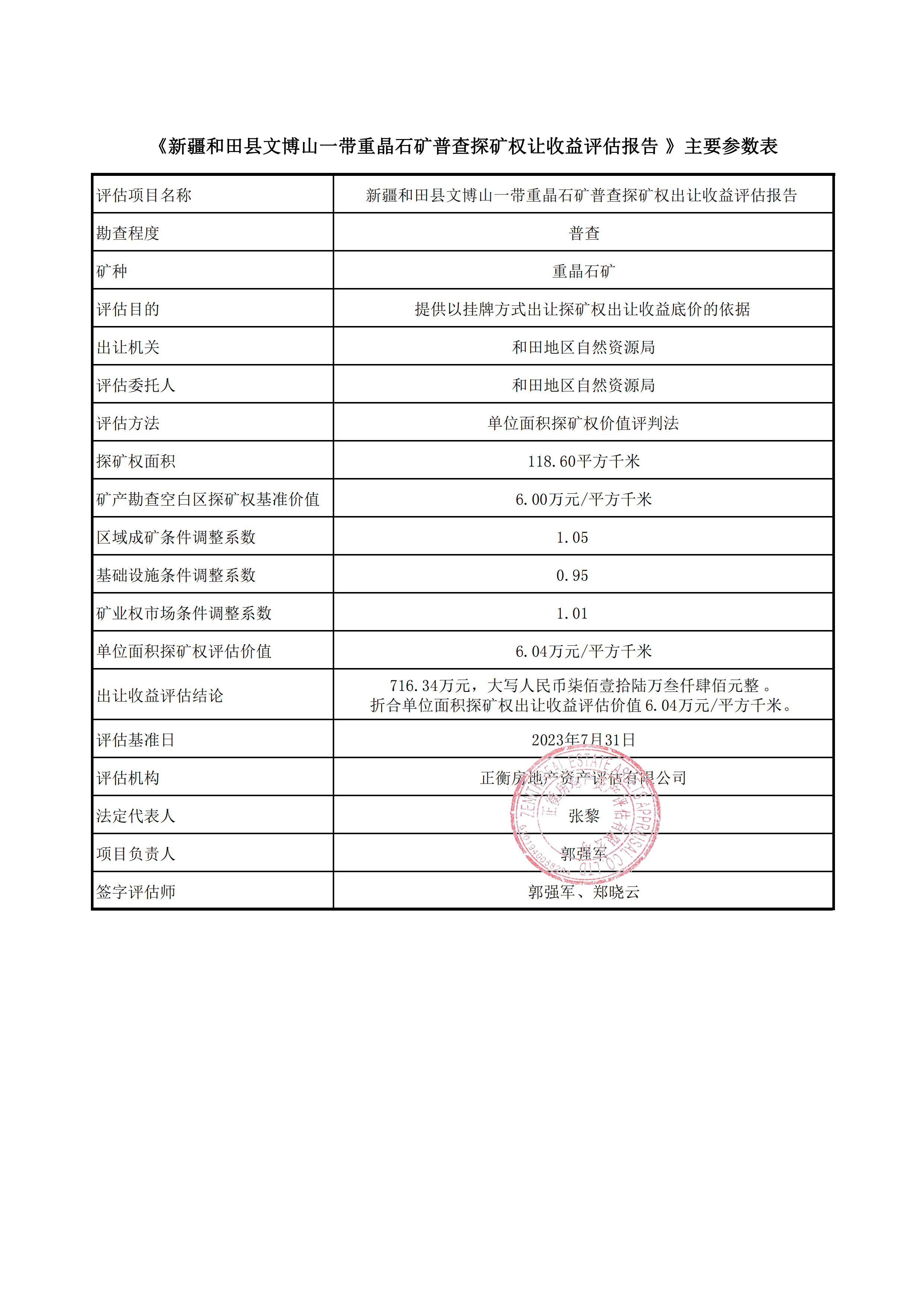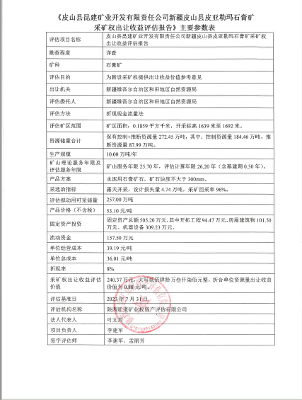 根據(jù)原國土資源部《關(guān)于印發(fā)〈礦業(yè)權(quán)評估管理辦法(試行)〉的通知》(國土資發(fā)〔2008〕174)、《關(guān)于加強(qiáng)礦業(yè)權(quán)評估行業(yè)管理的通知》等有關(guān)規(guī)定要求,新疆皮山縣伯峰石英礦普查探礦權(quán)出讓收益、新疆和田縣文博山一帶重晶石礦普查探礦權(quán)出讓收益、皮山縣皮亞勒瑪石膏礦普查采礦權(quán)出讓收益、皮山縣杜瓦鎮(zhèn)建筑用石英砂巖礦普查、新疆洛浦縣1號砂巖礦普查評估報(bào)告通過論證,現(xiàn)將相關(guān)情況予以公示。公示時(shí)間為2023年9月10日至2023年9月17日,如對公示內(nèi)容有異議,在公示期內(nèi)提出書面意見并送達(dá)和田地區(qū)自然資源局。
