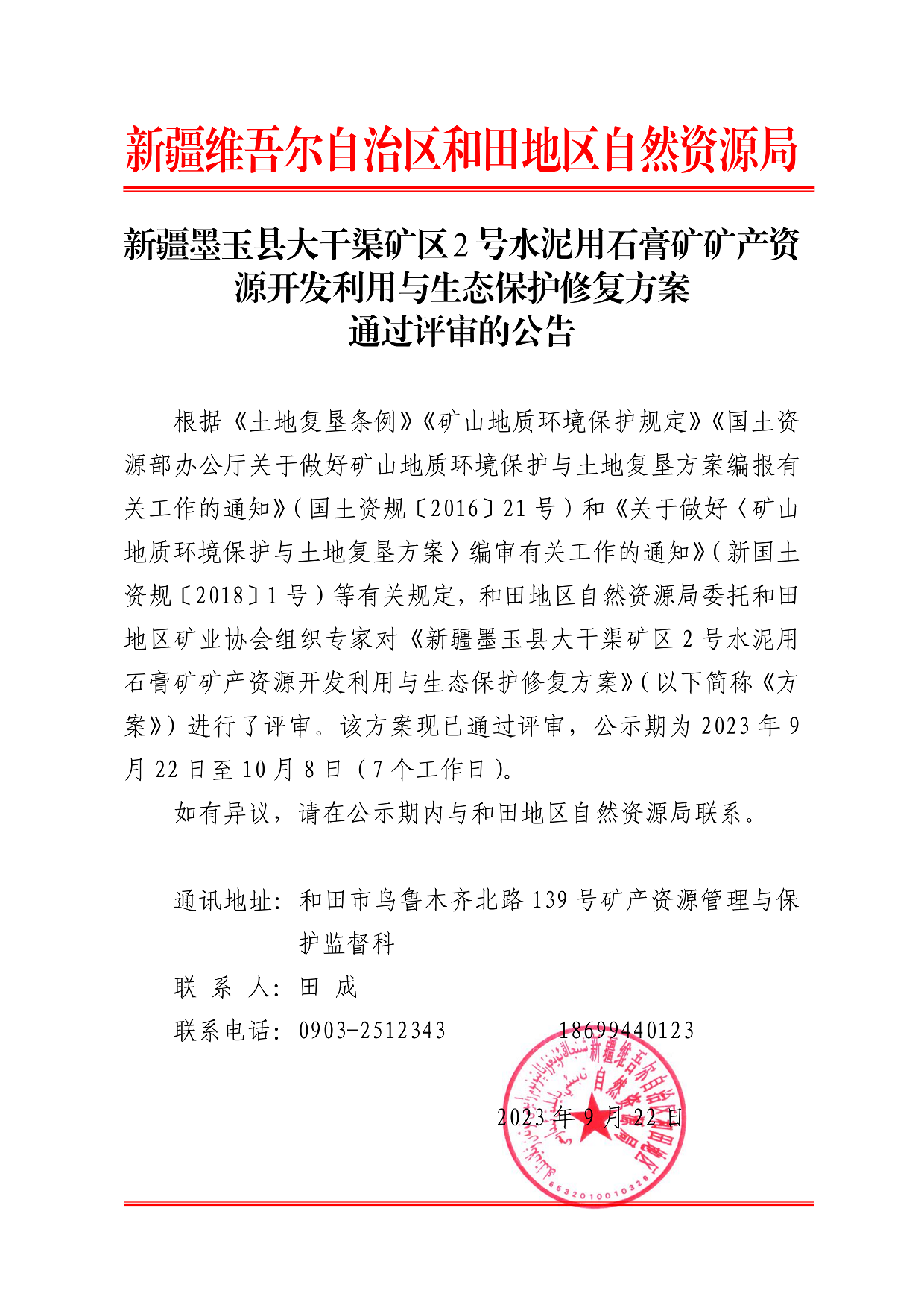 新疆墨玉縣大干渠礦區(qū)2號水泥用石膏礦礦產(chǎn)資源開發(fā)利用與生態(tài)保護(hù)修復(fù)方案通過評審的公告