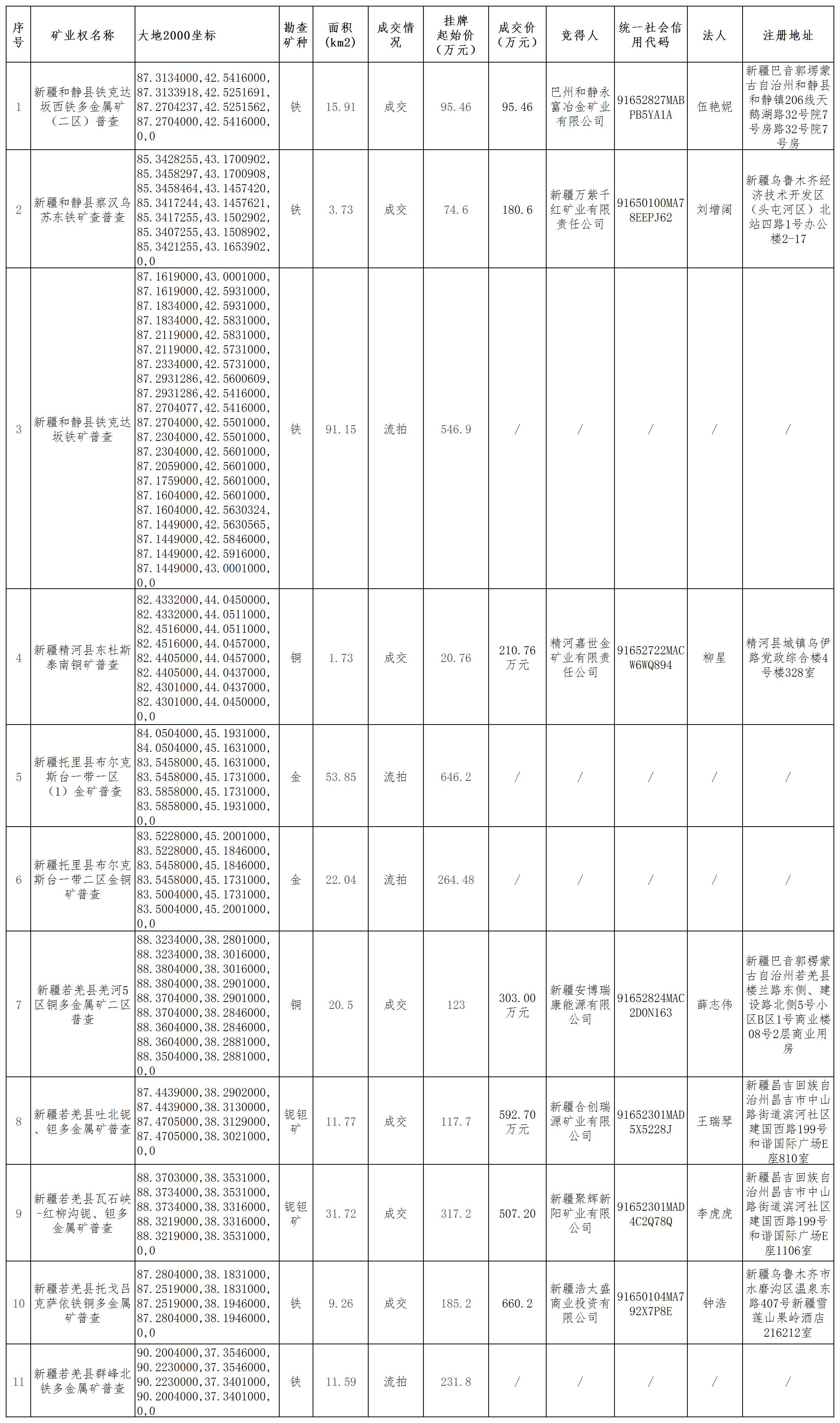 2024年01月08日,按照《2024年新疆和靜縣鐵克達坂西鐵多金屬礦(二區(qū))普查等11個探礦權掛牌出讓公告》(2024-KYQCR01),2024年新疆和靜縣鐵克達坂西鐵多金屬礦(二區(qū))普查等11個探礦權掛牌出讓結果公示在新疆維吾爾自治區(qū)政務服務和公共資源交易中心以網(wǎng)上 掛牌方式出讓成交。根據(jù)《礦業(yè)權出讓交易規(guī)則》等有關規(guī)定,現(xiàn)對該探礦權出讓有關事項進行公示。
