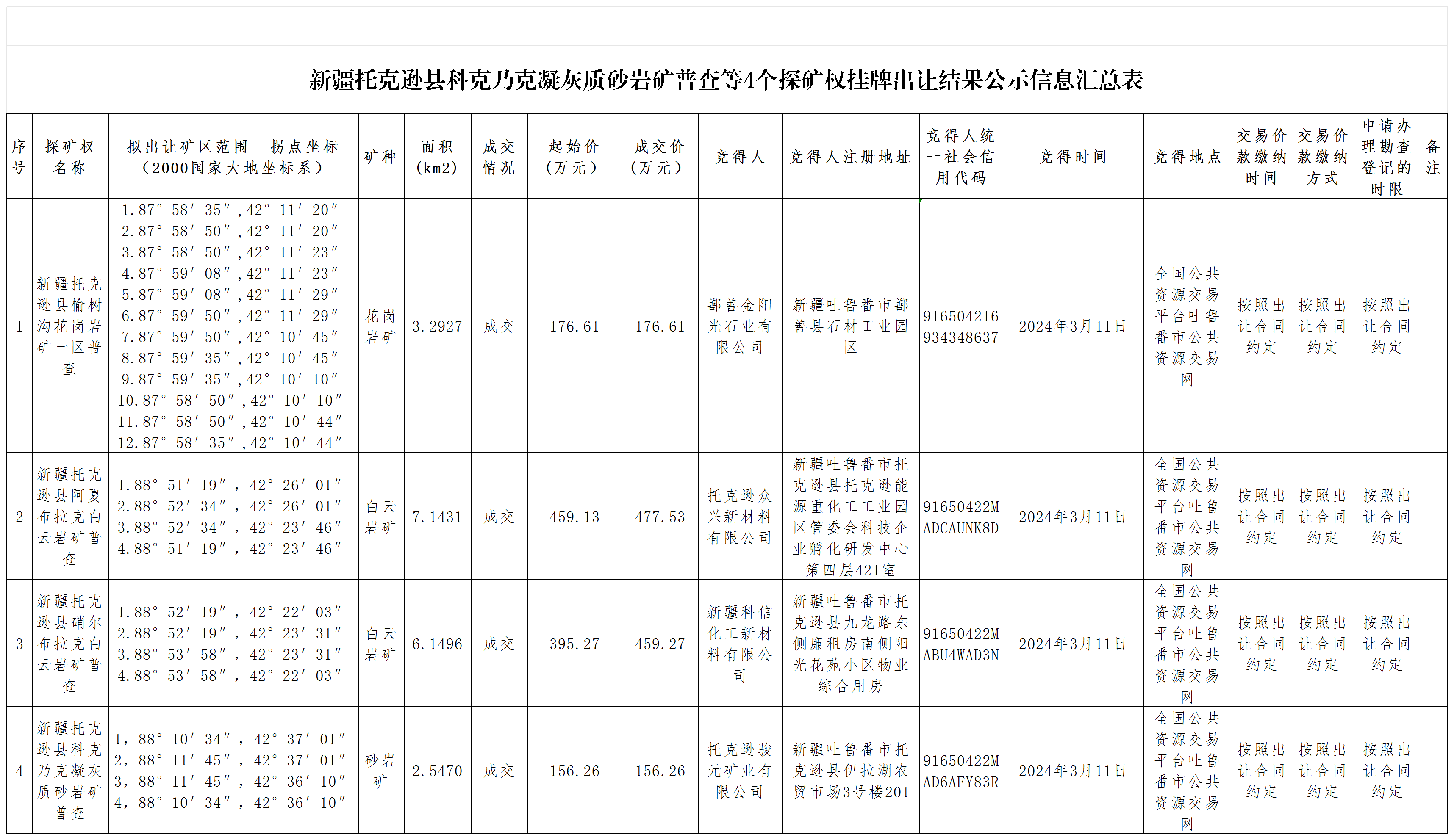 附件:新疆托克遜縣科克乃克凝灰質(zhì)砂巖礦普查等4個探礦權(quán)掛牌出讓結(jié)果公示信息匯總表