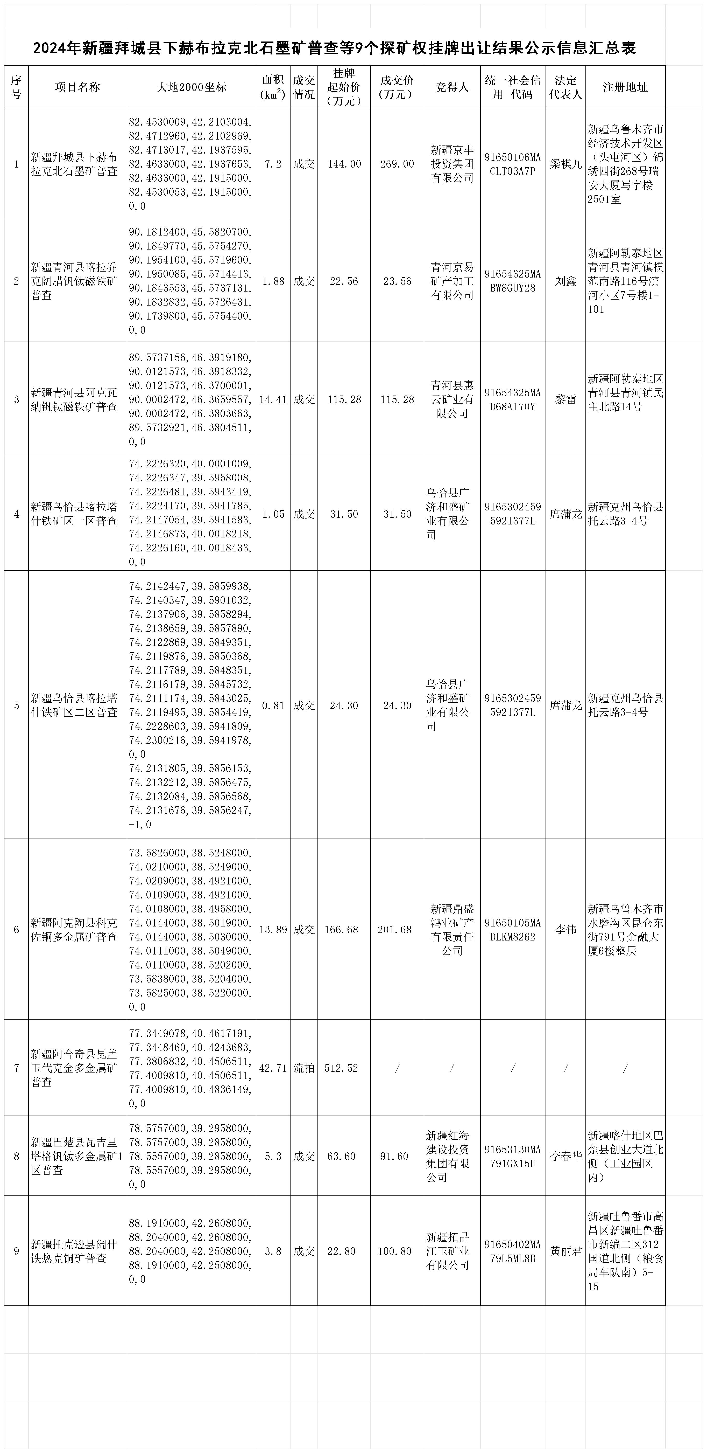 附表:2024年新疆拜城縣下赫布拉克北石墨礦普查等9個(gè)探礦權(quán)掛牌出讓結(jié)果公示信息匯總表