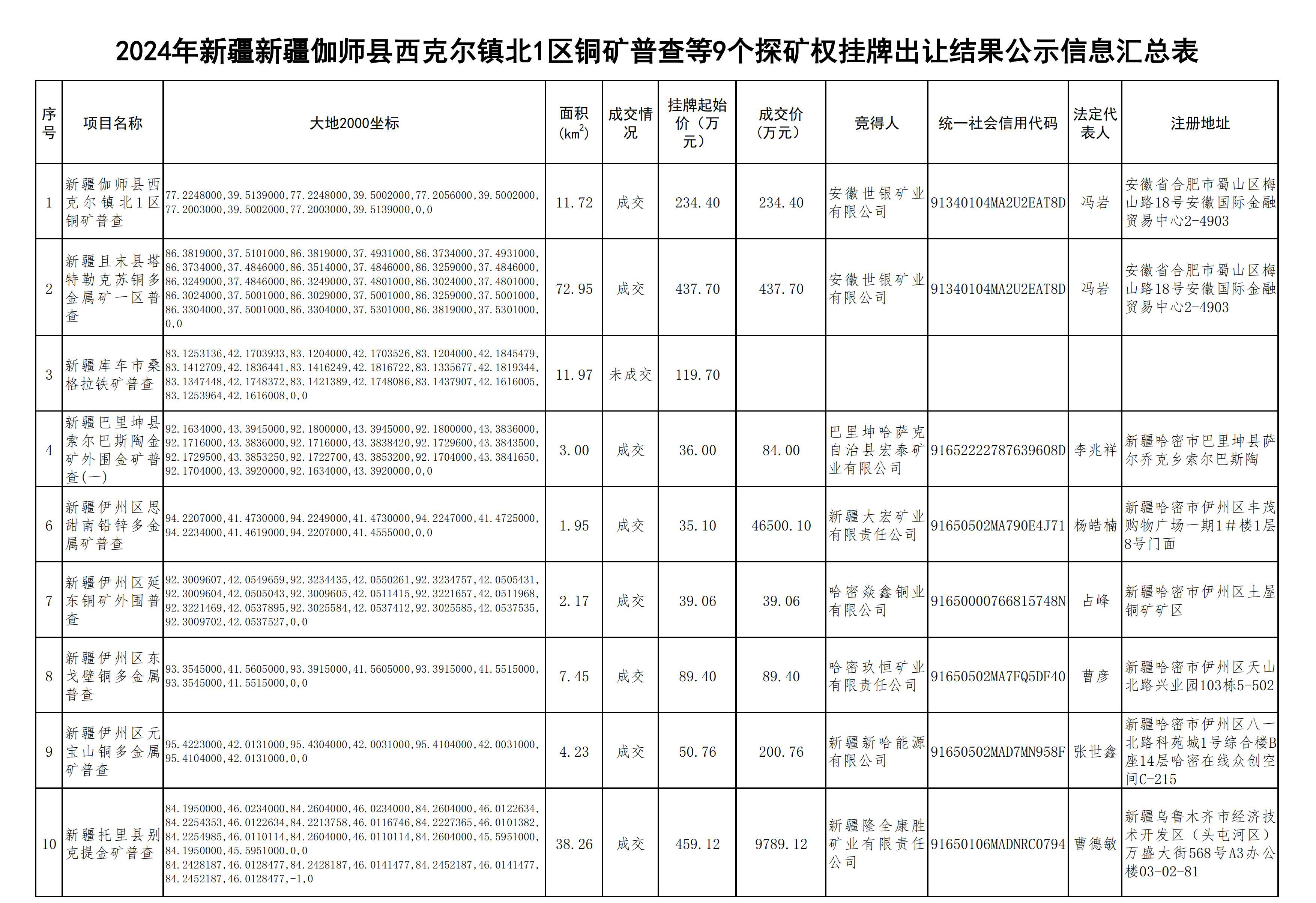 附件:新疆伽師縣西克爾鎮(zhèn)北1區(qū)銅礦普查等9個(gè)探礦權(quán)掛牌出讓結(jié)果公示信息匯總表