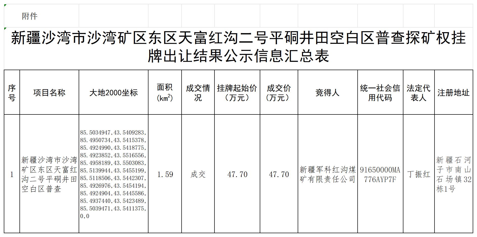 附件:2024年新疆沙灣市沙灣礦區(qū)東區(qū)天富紅溝二號平硐井田空白區(qū)普查探礦權掛牌出讓結果公示信息匯總表
