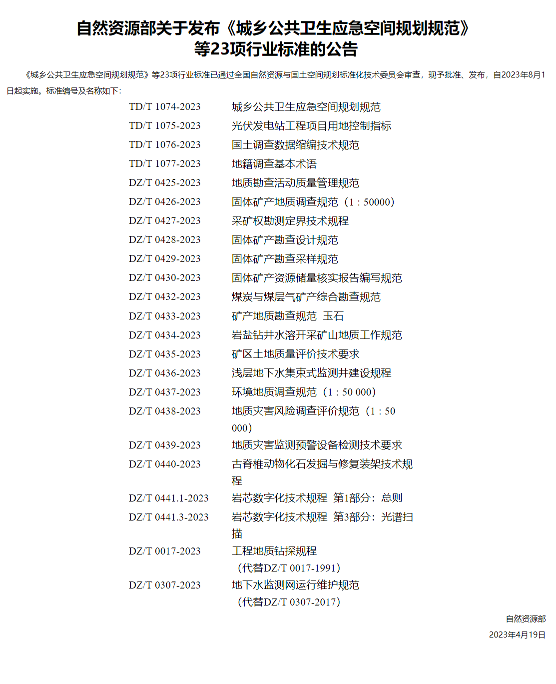 根據(jù)自然資源部發(fā)布的2023年第19號公告,由中國地質(zhì)調(diào)查局水文地質(zhì)環(huán)境地質(zhì)調(diào)查中心修訂的地質(zhì)礦產(chǎn)行業(yè)標(biāo)準(zhǔn)《工程地質(zhì)鉆探規(guī)程(DZ/T 0017-2023)》近日獲批發(fā)布,并將于2023年8月1日起實(shí)施。