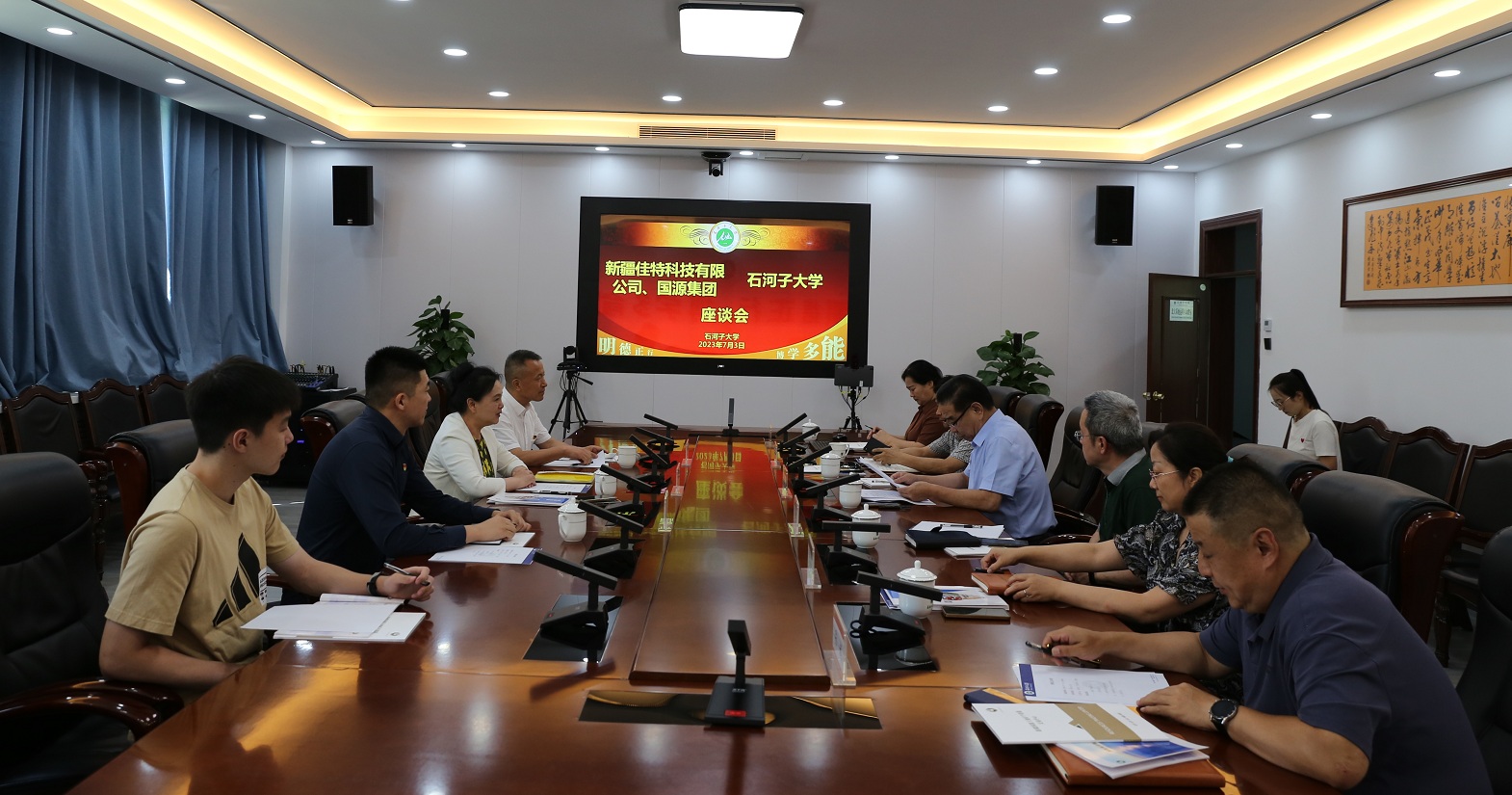 為響應(yīng)國家政策號召,促進與高校的交流合作,2023年7月3日下午,國源集團黨工委書記、總裁楊 杰、總裁(黨工委)辦主任袁 岳,新疆佳特科技有限公司董事長文 彬等一行赴石河子大學(xué)就校企合作事宜進行座談交流。石河子大學(xué)黨委常委、副校長童軍茂主持座談會,商學(xué)院黨委副書記、院長馮光明,繼續(xù)教育學(xué)院黨委書記李 剛,發(fā)展與規(guī)劃處副處長張 燕,教務(wù)處副處長李 玲,資產(chǎn)管理處副處長張超,及信息與大數(shù)據(jù)學(xué)院、藥學(xué)院等相關(guān)負責(zé)人參加座談。