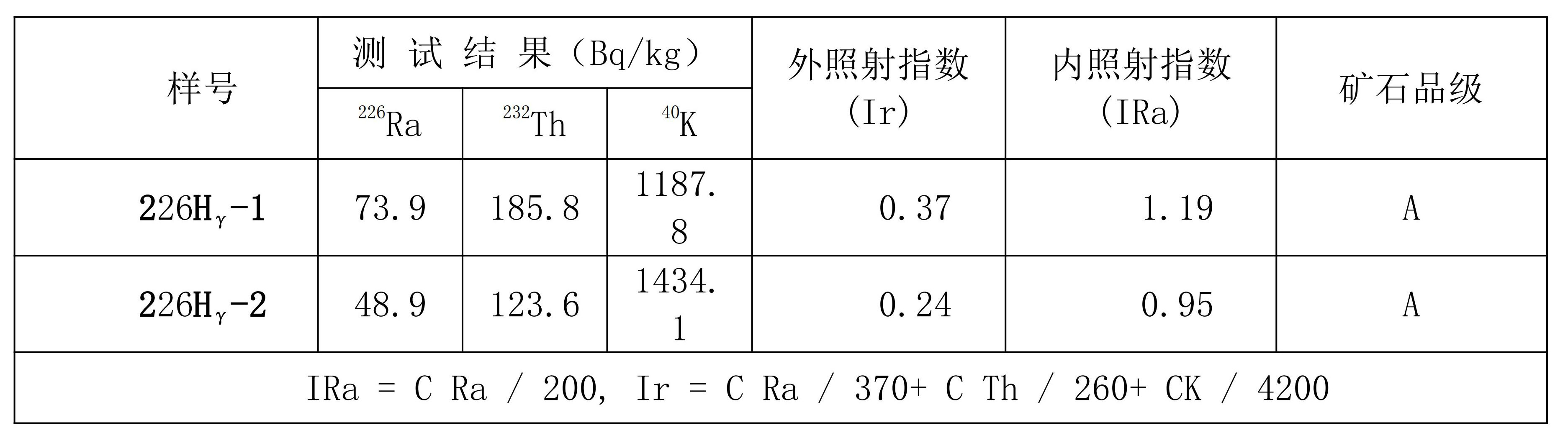 依據(jù)《天然石材產(chǎn)品放射防護(hù)分類(lèi)控制標(biāo)準(zhǔn)》(JC518-93)5.1 關(guān)于天然石材γ照射量率低于或等于5.2×10°μC/kg·h(20μR/h)時(shí)不必作天然放射性核素比活度檢測(cè)的規(guī)定,礦體的各測(cè)定值均滿足要求,不具放射性。礦石放射性指數(shù)測(cè)定如下: