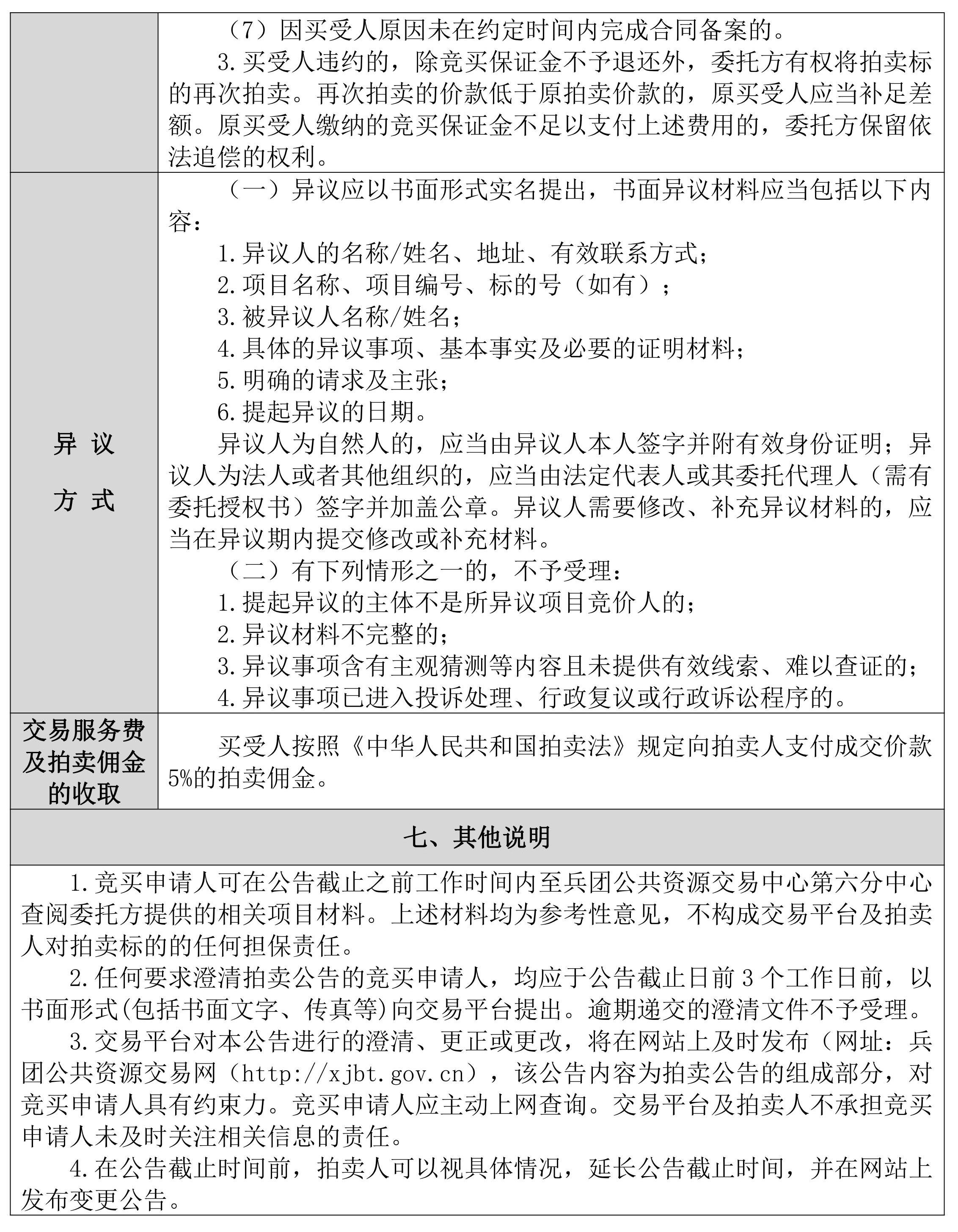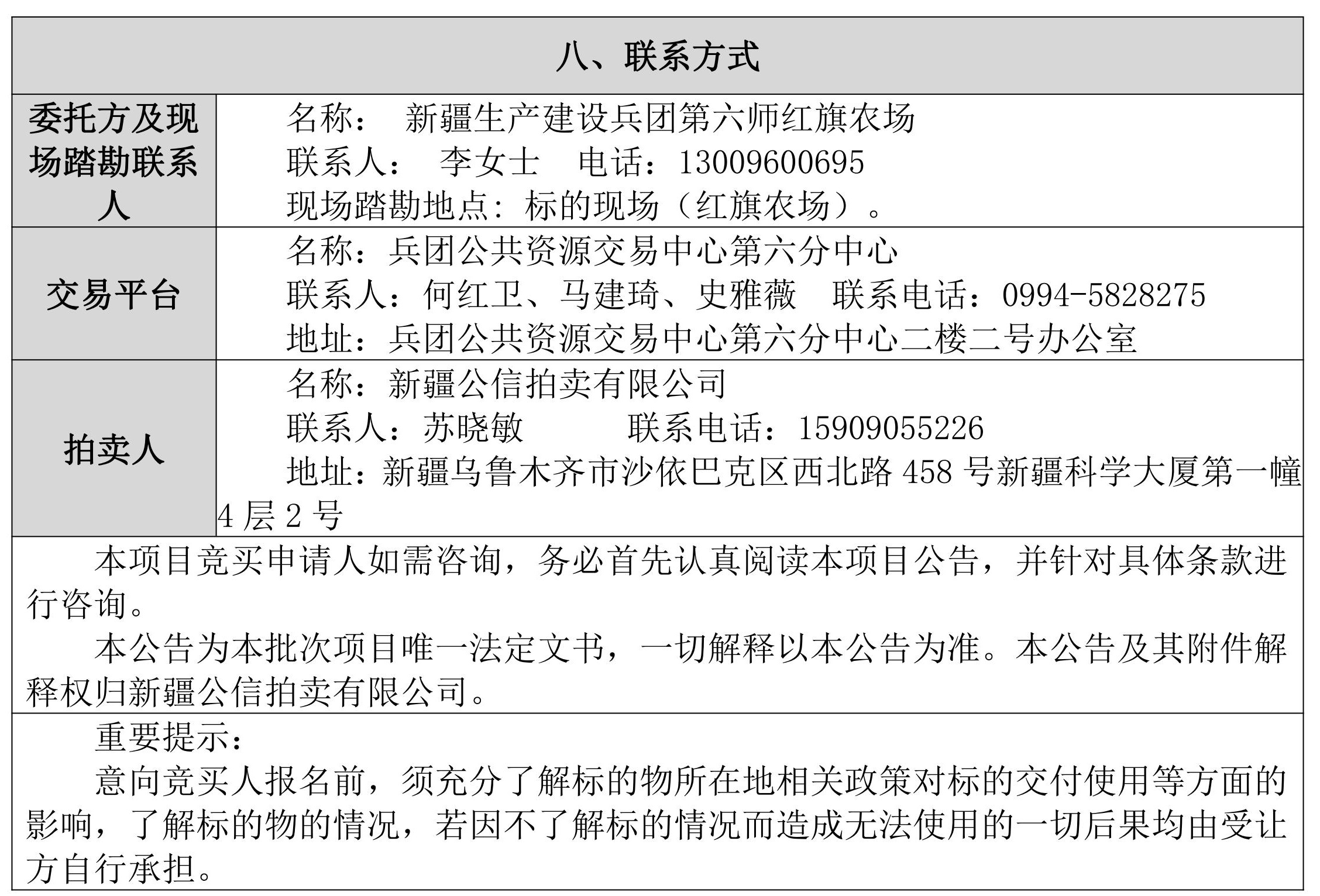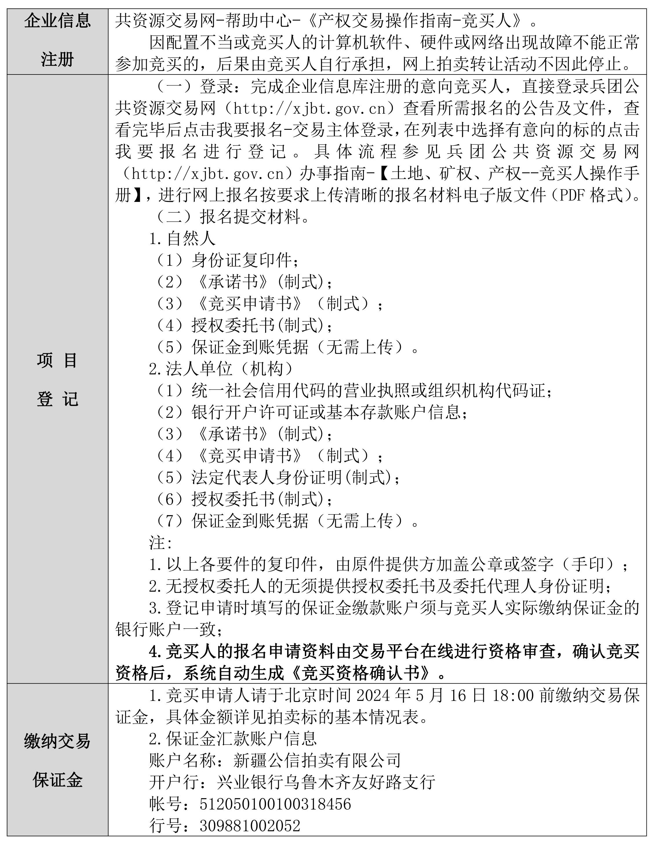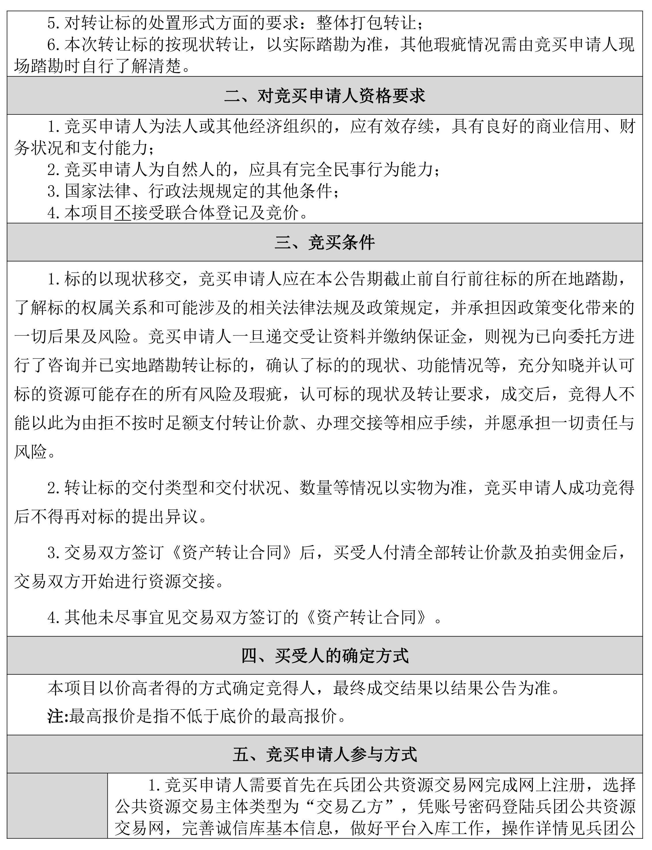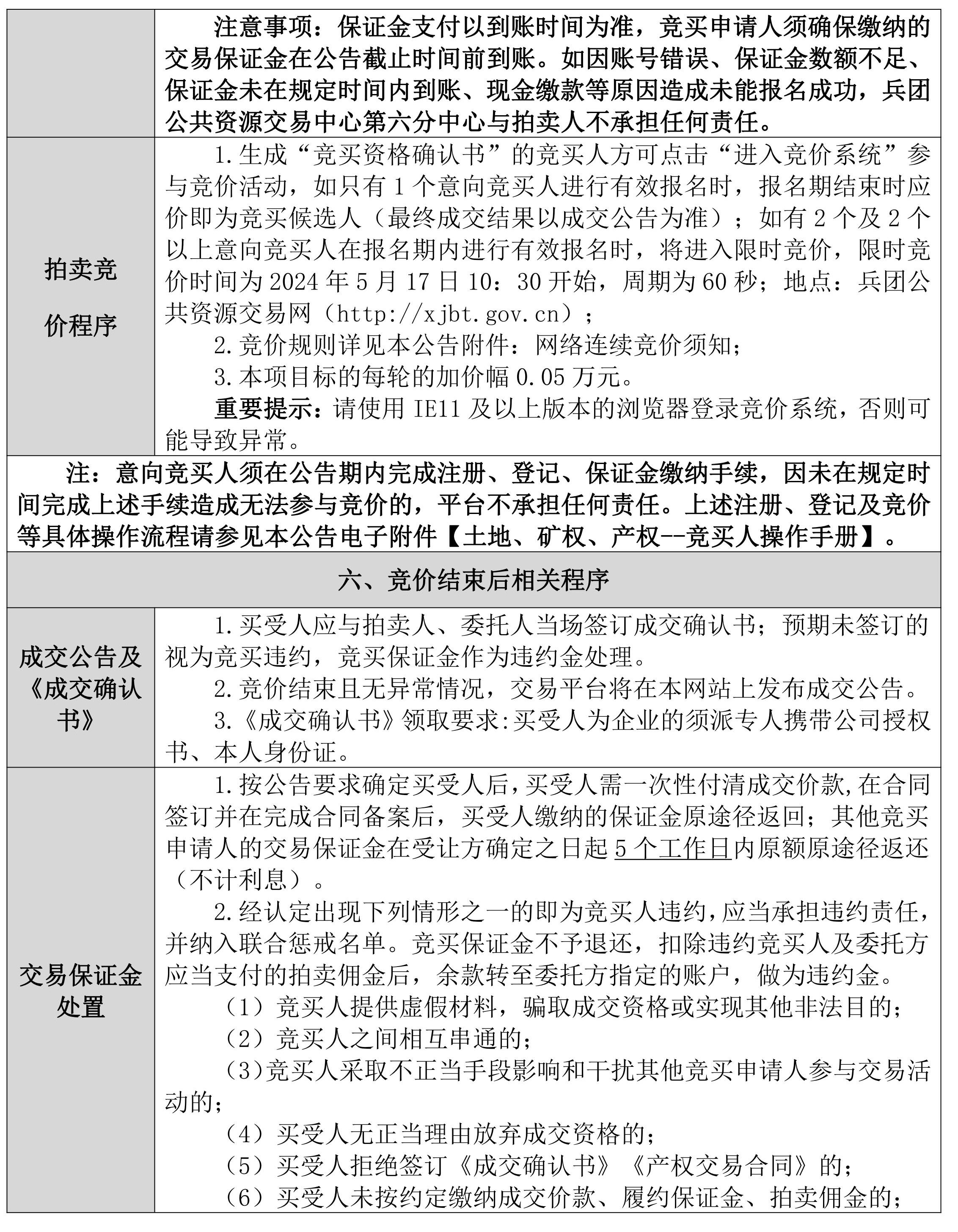 7.競(jìng)買人在兵團(tuán)網(wǎng)獲得網(wǎng)員報(bào)名中的“資格確認(rèn)書”后才能參加當(dāng)天拍賣會(huì)標(biāo)的的網(wǎng)上競(jìng)價(jià)。拍賣會(huì)當(dāng)天,競(jìng)買人應(yīng)提前20分鐘使用臺(tái)式或便攜式計(jì)算機(jī)登錄兵團(tuán)網(wǎng)。若無法登錄請(qǐng)及時(shí)聯(lián)系15909055226.如果拍賣過程中突然斷線或網(wǎng)頁(yè)出現(xiàn)異常情況,請(qǐng)及時(shí)刷新網(wǎng)頁(yè)或重新登陸系統(tǒng)。凡在兵團(tuán)網(wǎng)平臺(tái)上以市場(chǎng)主體登錄競(jìng)買人的賬號(hào)和密碼所進(jìn)行的操作,即視為競(jìng)買人認(rèn)可本公司所有紙質(zhì)資料和網(wǎng)絡(luò)發(fā)布資料。操作行為均被視為競(jìng)買人的行為,競(jìng)買人須對(duì)以其賬號(hào)進(jìn)行的所有活動(dòng)和事件承擔(dān)法律責(zé)任。