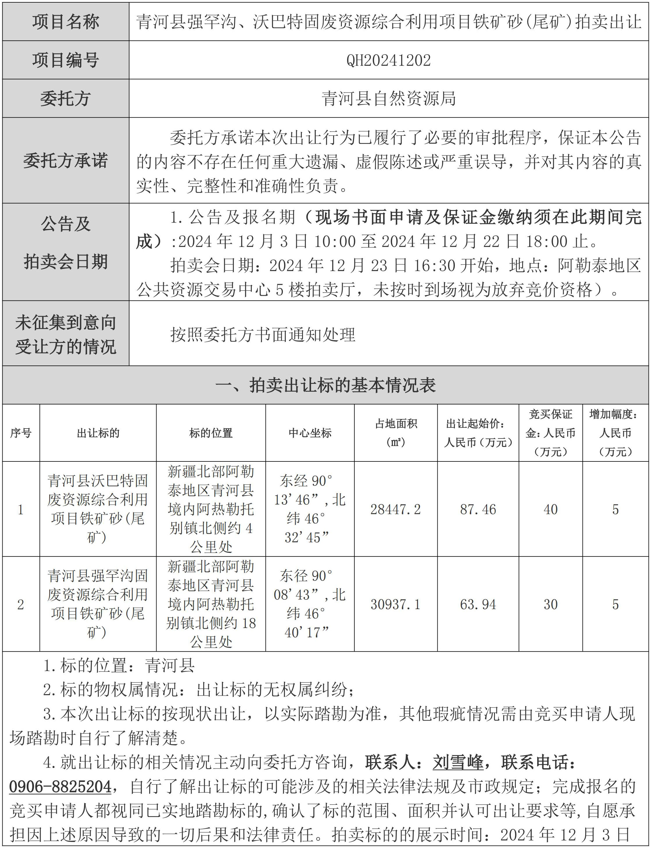 青河縣強(qiáng)罕溝、沃巴特固廢資源綜合利用項(xiàng)目鐵礦砂(尾礦)拍賣出讓公告