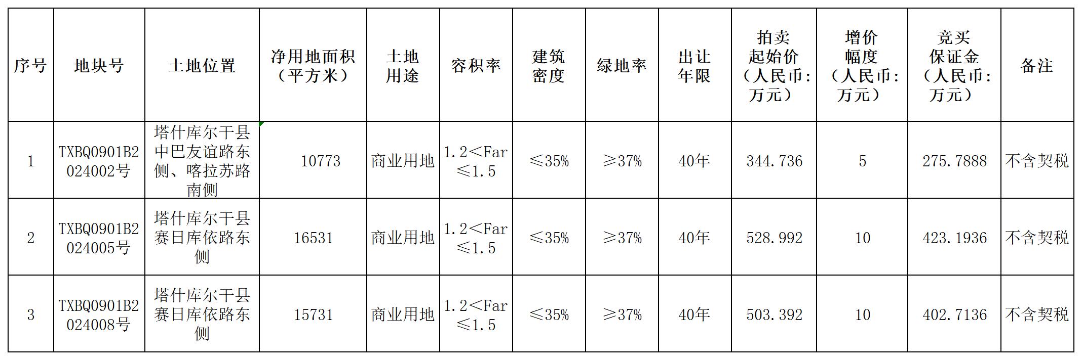 根據(jù)《中華人民共和國土地管理法》《招標拍賣掛牌出讓國有建設用地使用權規(guī)定》(國土資源部令第39號)、《自治區(qū)深化公共資源交易平臺整合共享工作方案〉的通知》(新政辦函〔2019〕250號)等有關法律法規(guī)及文件的規(guī)定,經(jīng)塔什庫爾干塔吉克自治縣人民政府批準,塔什庫爾干塔吉克自治縣自然資源局決定以拍賣方式出讓3(幅)地塊的國有建設用地使用權。并委托新疆公信拍賣有限公司、新疆國源土地礦產(chǎn)資源交易中心公開拍賣出讓,現(xiàn)將有關事項公告如下: