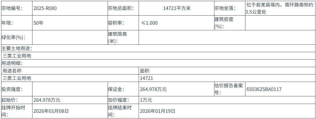 2025-R080 號(hào)地塊:2026年01月08日 10時(shí)00分 至 2026年01月19日 12時(shí)00分;