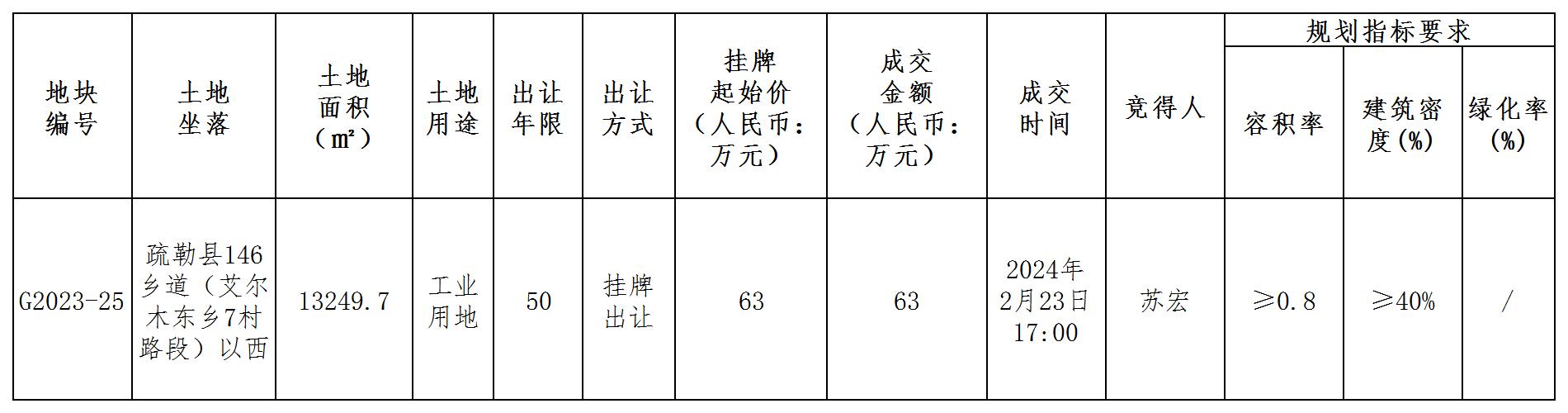 疏勒縣自然資源局國(guó)有建設(shè)用地使用權(quán)掛牌出讓成交結(jié)果公示(勒自然成字[2024]05號(hào))