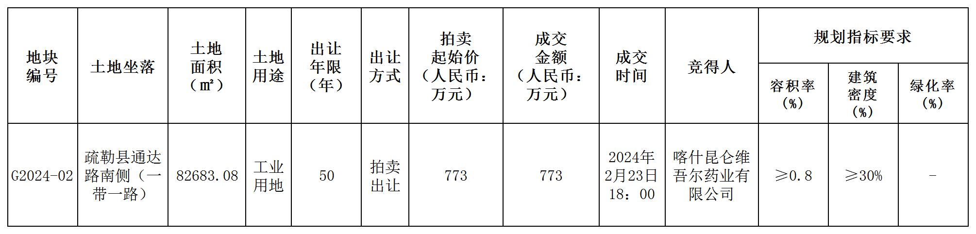 疏勒縣自然資源局國有建設(shè)用地使用權(quán)拍賣出讓成交結(jié)果公示(勒自然成字[2024]06號)