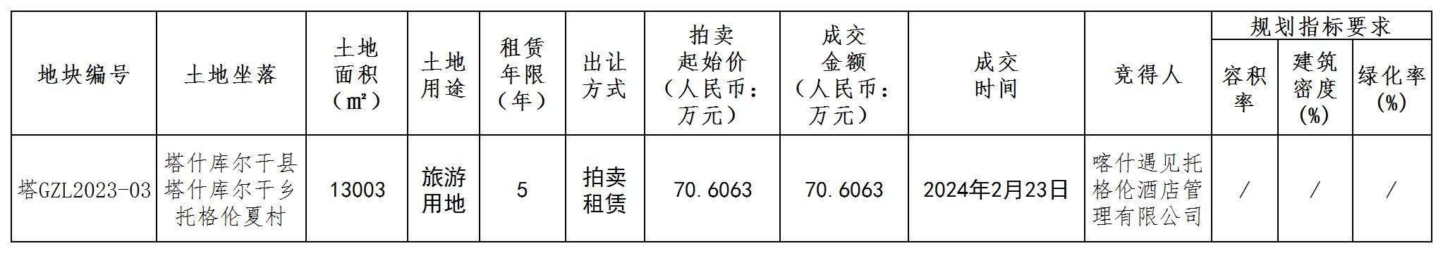 塔什庫(kù)爾干塔吉克自治縣自然資源局國(guó)有建設(shè)用地使用權(quán)拍賣(mài)租賃成交結(jié)果公示(塔自然資示[2024-21號(hào))