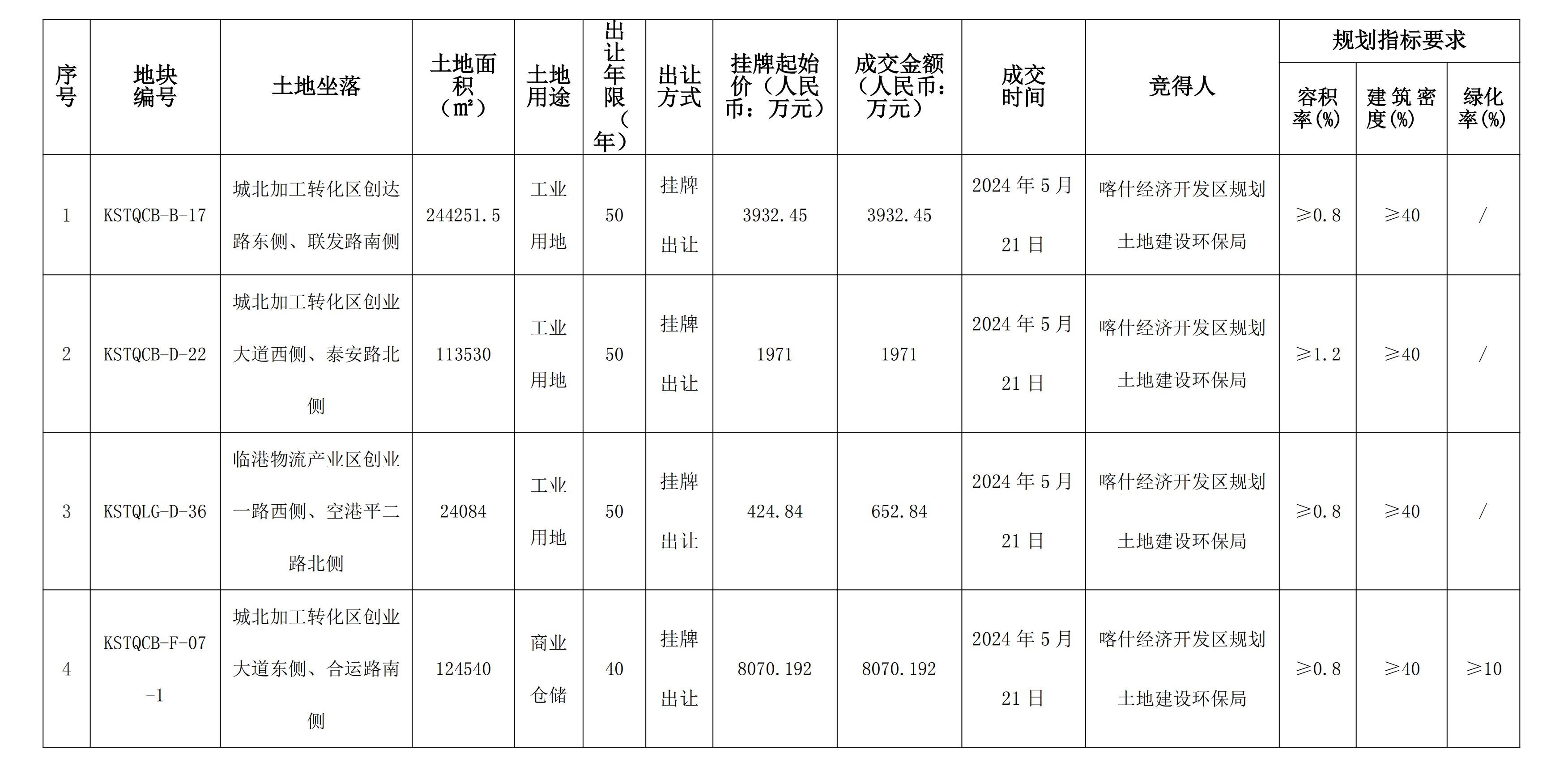 喀什地區(qū)自然資源局喀什經濟開發(fā)區(qū)分局國有建設用地使用權成交結果公示