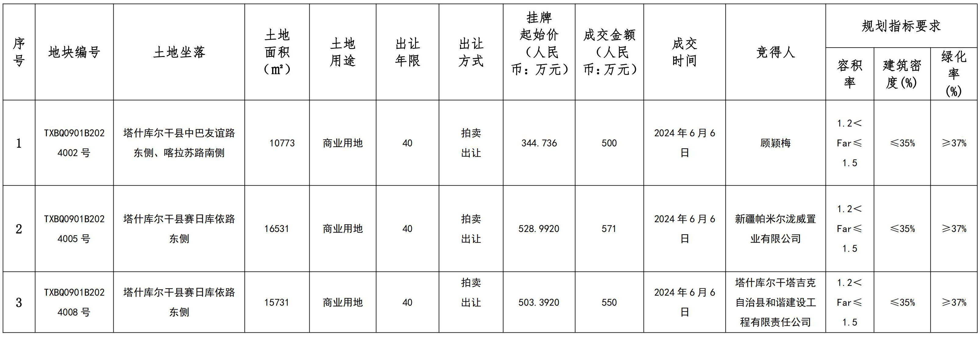 塔什庫(kù)爾干塔吉克自治縣自然資源局國(guó)有建設(shè)用地使用權(quán)拍賣出讓成交結(jié)果公示