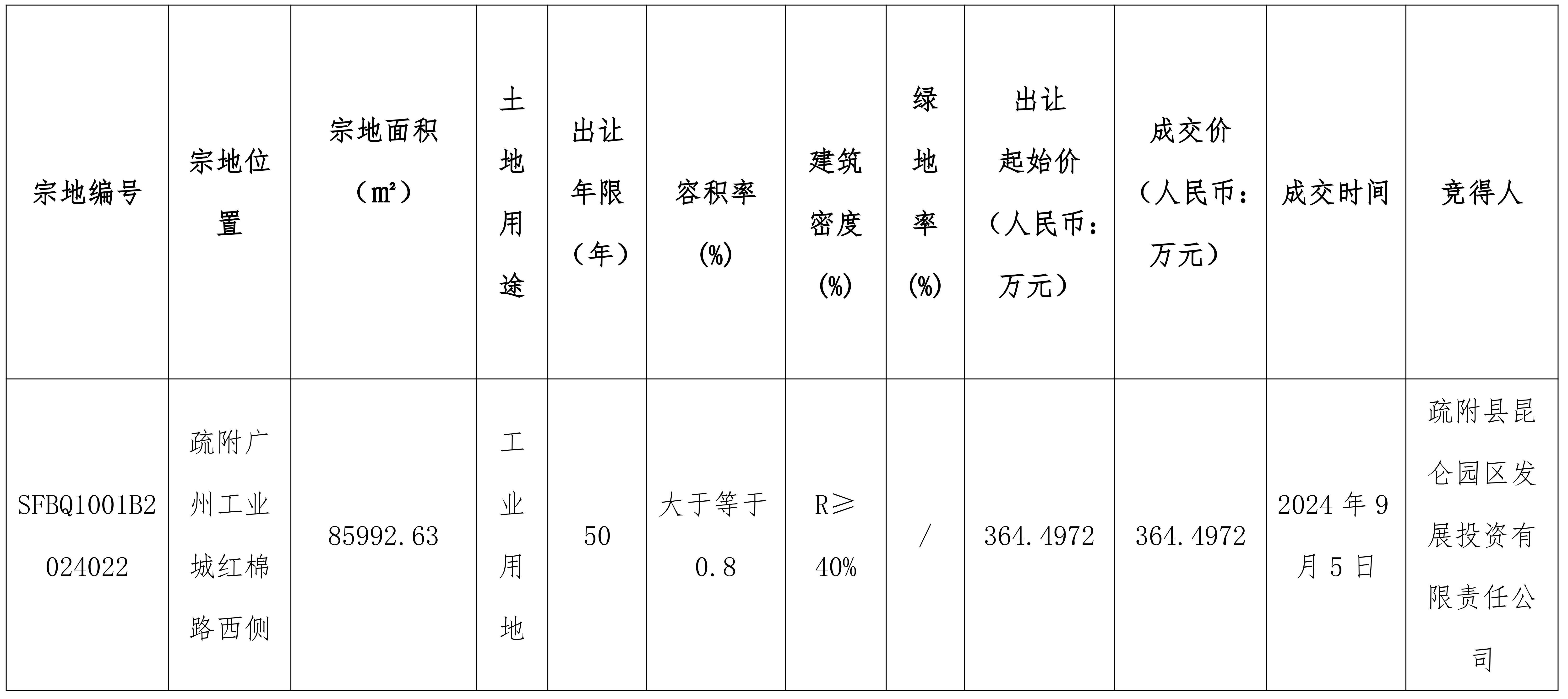 根據(jù)《中華人民共和國土地管理法》《招標拍賣掛牌出讓國有建設用地使用權規(guī)定》(國土資源部令第39號)《自治區(qū)深化公共資源交易平臺整合共享工作方案〉的通知》(新政辦函〔2019〕250號)等有關法律法規(guī)及文件的規(guī)定,疏附縣自然資源局以掛牌方式出讓1(幅)地塊的國有建設用地使用權,現(xiàn)將出讓成交結果公示如下: